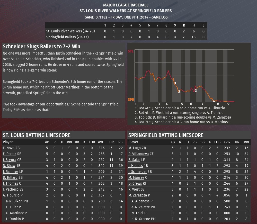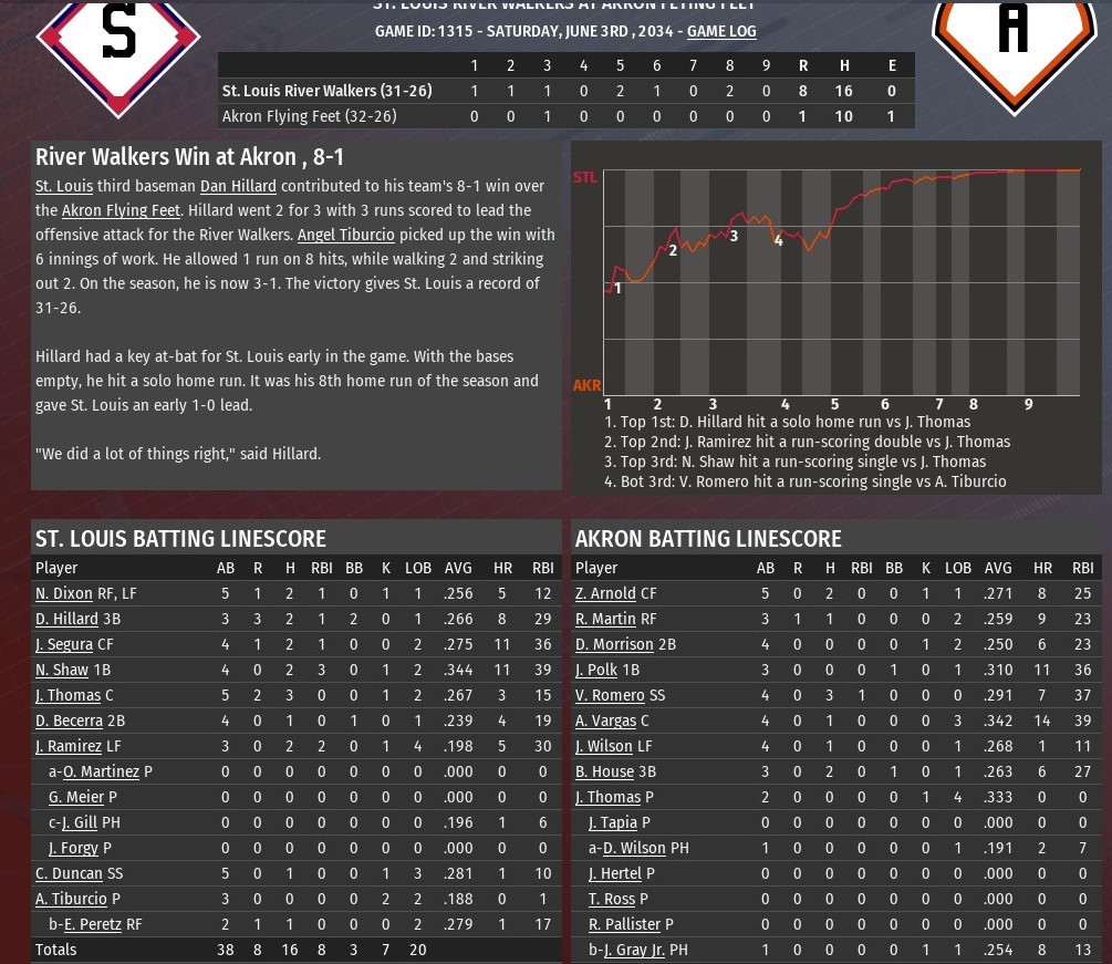 Tied 1-1, Daniel Becerra hit a grand slam to highlight a five-run top of the third inning for St. Louis, and the River Walkers poured it on from there routing Akron 16-1 at Candlestick Park (1993). Becerra's slam drove in the final four runs of the outburst for the Walkers. The first run scored when Jose Ramirez drew a bases-loaded walk from Flying Feet starting pitcher Orland Claude. Claude issued two walks, hit a batter in the inning, in addition to being taken deep by Becerra. St. Louis added a single run in the fourth -- Will Banfield led off with a double off reliever Braxton Ashcraft and scored on a Freudis Nova ground out -- and two more in the sixth -- A RBI double from rookie starting pitcher Kyle Smarr and a run-scoring single from Eric Peretz -- to up its lead to 9-1. The Walkers poured it on late with three runs in the eighth and four more in the ninth. Peretz drove in two runs with a single in the eighth, while Becerra collected his fifth RBI of the game, also with a single. Nova hit a three-run homer to highlight the ninth. All the offense overshadowed a strong MBL debut for Smarr. Making a start for a rotation which needed a rest, he allowed one run on four hits over six innings. Smarr (1-0) struck out five and walked two. Luke Dunkin pitched a pair of scoreless innings. Oscar Martinez followed suit in the ninth. |