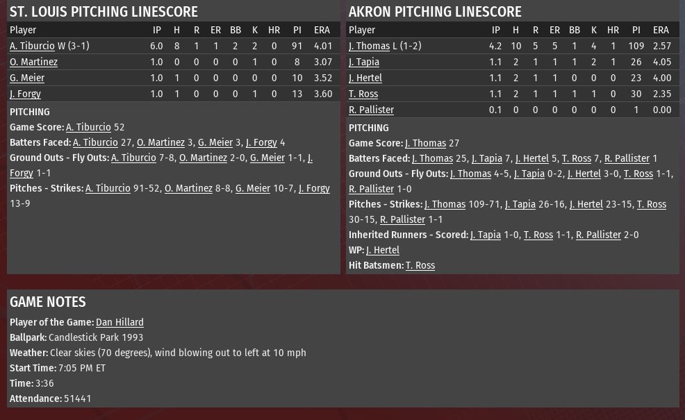 St. Louis scored at least one run in five of the first six innings, paving the way for an 8-1 win over Akron at Candlestick Park. The River Walkers scored single runs in each of the first three innings, going up 3-0. Dan Hillard hit a solo homer off Flying Feet starting pitcher Joel Thomas in the first. Jared Thomas led off the second with a double, and scored on a Jose Ramirez double. Hillard doubled with one out off Thomas in the third, and scored on a Nick Shaw single. After not scoring in the fourth, and its lead shrinking to 3-1, St. Louis tallied twice in the fifth. Jose Segura led off the inning with a triple off Thomas. He scored on a Shaw fly ball. Jared Thomas followed with a single. A Daniel Becerra single moved Thomas to third. Ramirez collected his second RBI of the game with a fly ball to right. Nathaniel Dixon made it 6-1 with a solo homer off Jose Tapia in the sixth. St. Louis added to its advantage with two runs in the eighth. Segura (fly ball) and Shaw (RBI double) drove in the runs off Tom Ross. After a rough start to his season, St. Louis starting pitcher Angel Tiburcio turned in his third straight impressive start since coming off the injured list. Tiburcio (3-1) worked the first six innings, allowing one run on eight hits. He struck out seven and walked two. Single scoreless innings from Oscar Martinez, Gil Meier and Josh Forgy closed out the win. |
