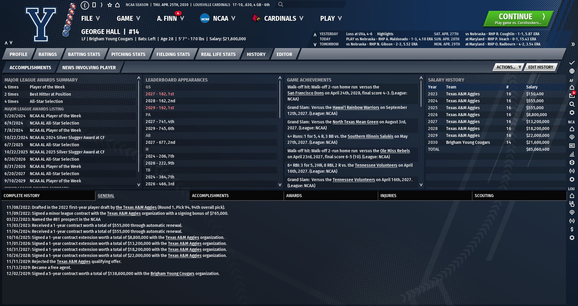 Back-back-back-gone! George Hall hit his 300th home run tonight against the Idaho Vandals. Hall, of the Brigham Young Cougars, smiled as he rounded all the bases and got mobbed by his teammates at home plate. The game did stop momentarily as the Cougars celebrated this accomplishment. "I was swinging for the fences and the pitch looked like a giant grape fruit," Hall said. "This is another check off my bucket list. I'll now be setting my sights the next milestone." The Cougars left fielder went 2 for 3 with 1 home run and 4 RBI as the Brigham Young Cougars won 12-1 over the Idaho Vandals. His all-time numbers show Hall is carrying a .310 career batting average with 300 home runs and 840 RBIs. |