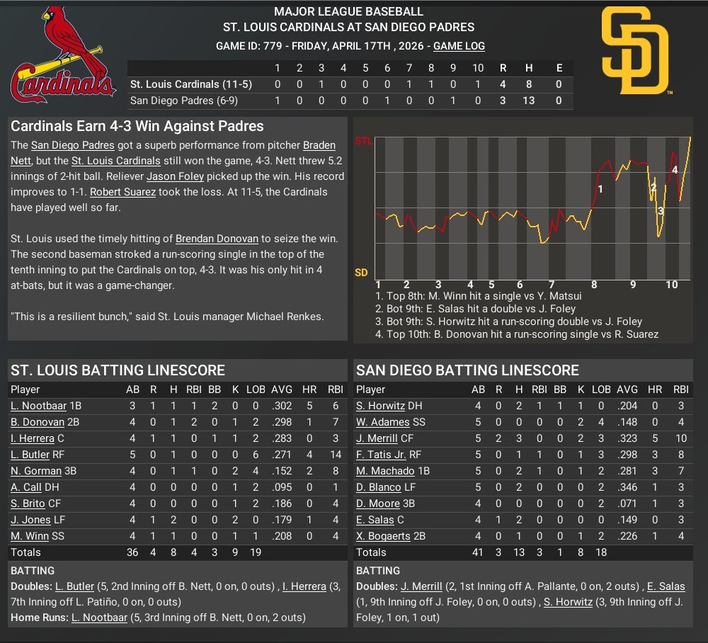 Cards news: April 17 -- St. Louis Cardinals 4, San Diego Padres 3, 10 innings
