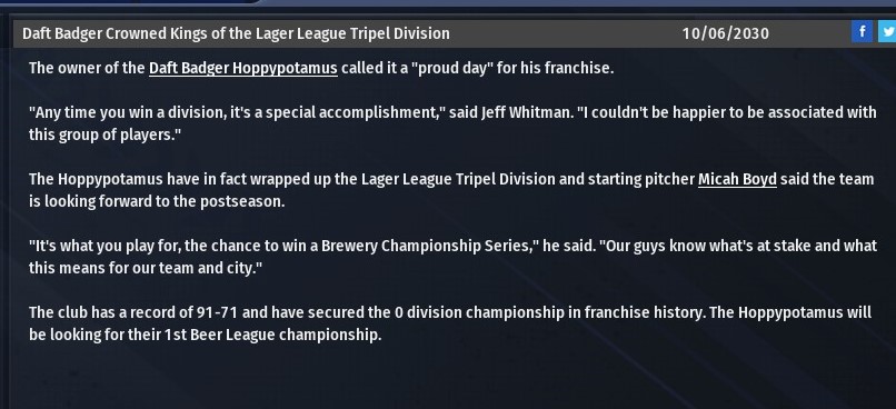 Texas Leaguer assured their place in this seasons playoffs with a win yesterday. They hold a slim half game lead for the division crown over Daft Badger as they seek their 3rd Tripel division crown in 4 seasons. |