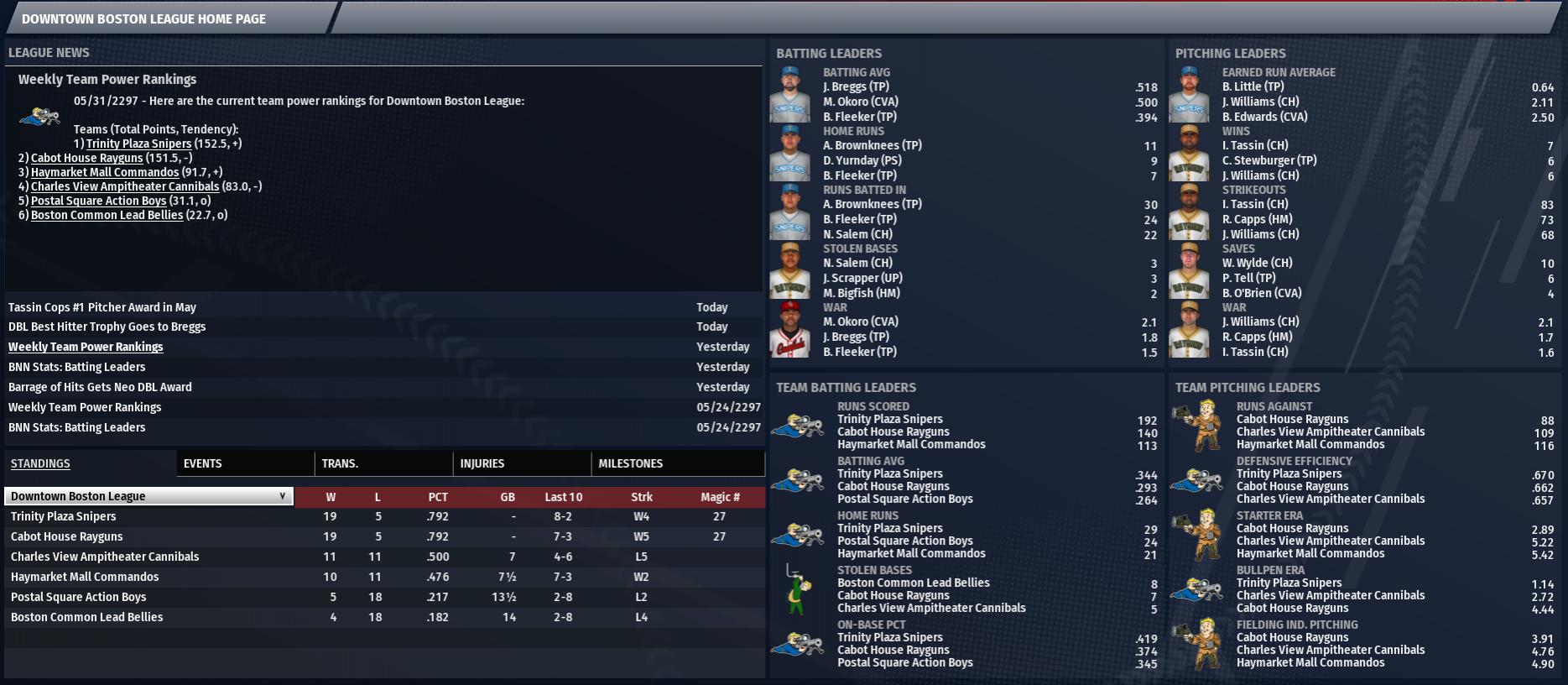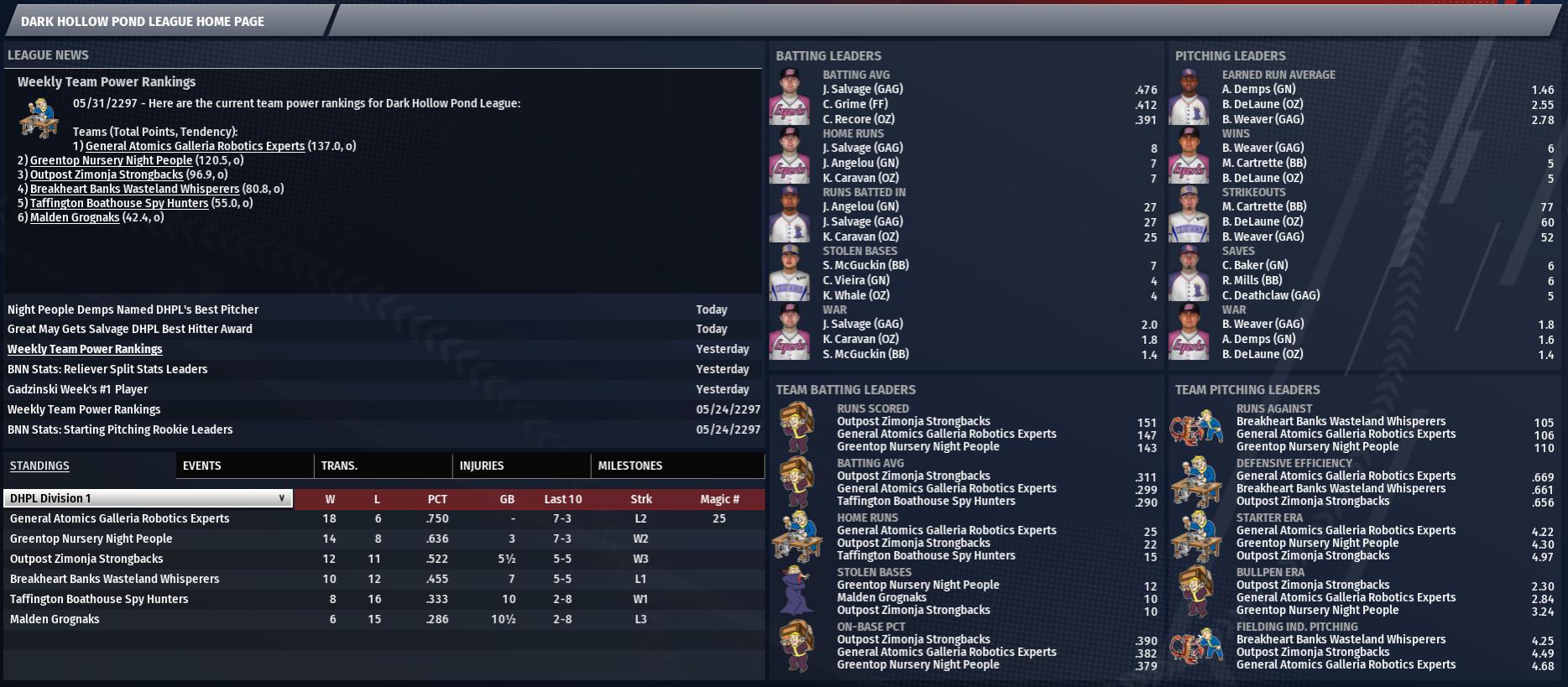 Even further ahead, the Oberland T-51s (20-7, 7-3 in their last 10) is currently on a six-game winning streak. Opponents in the Railroad League just cannot score against the T-51s, with all three starters pitching well, and the bullpen matching (both with 3.76 ERA). Sheng Kawolski (5-2, 3.06), Gerald Jerry (4-1, 3.50), and Matt Udder 6-1 (4.80) are all ace quality. The RL looks to be on the way to being over three-quarters into the season. The rest of the race is for second. Currently, that team is the Fairline Hill Estates Yao Guai, but Egret, Vault 81, and Shaw are all within distance.