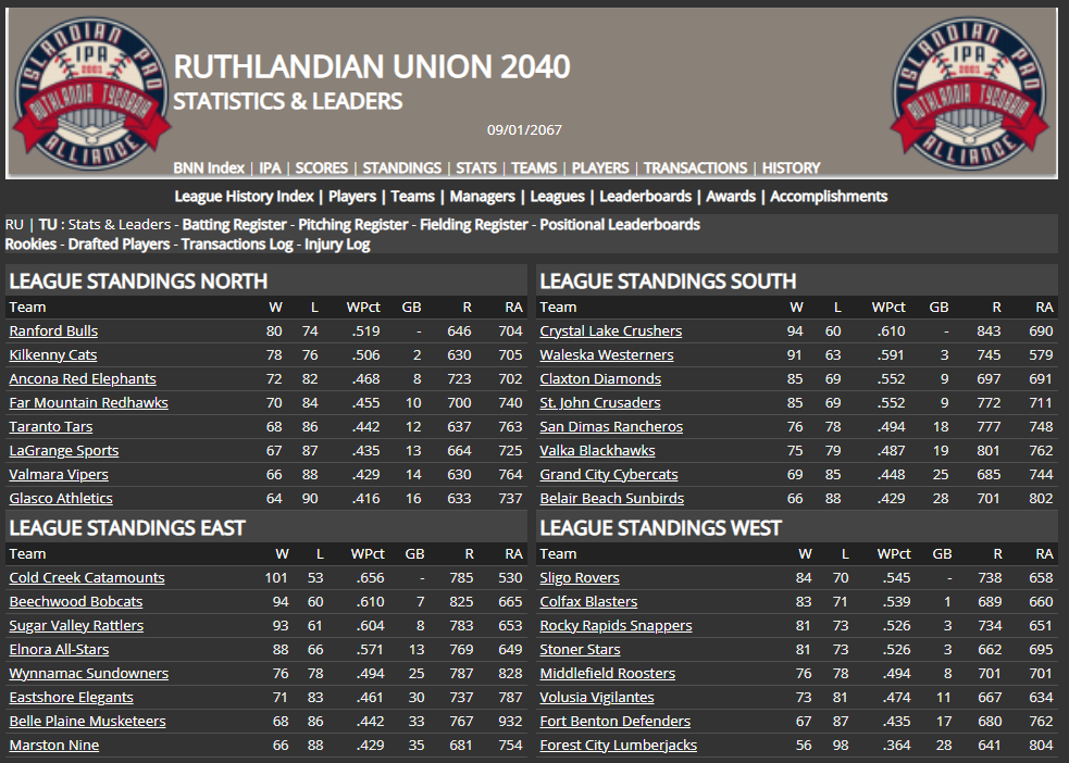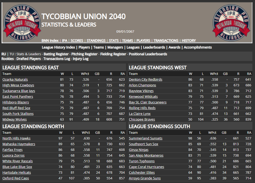 Am still waiting patiently for the data related to the Blue Sox, EC. Hope to receive it soon, while I continue working on adding the Islandian Pro Alliance teams and all to the related quickstart. No hurry, but the sooner I can have that data, the better, I think, to help finish filling out the teams for the NABA. Thank you for your time and all, EC. CD out.