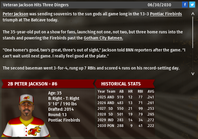 Pontiac 2b Peter Jackson hits 3 HR. Sony CF Charles Duggleby hits for the Cycle. Chevy Vipers traded 2b Enea Travolta to the Philadelphia Phillies for C Randy Pryor.