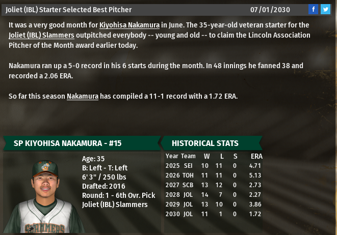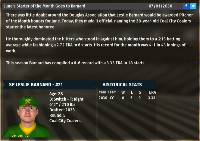 Bird City SP Bookie Boland is named AL POTM. Ford SP Glenn Dumas is named NL POTM. Pontiac CF Jimmy Bostic Jr is named AL ROTM. Skywalker CF Rodney Hyde is named NL ROTM.