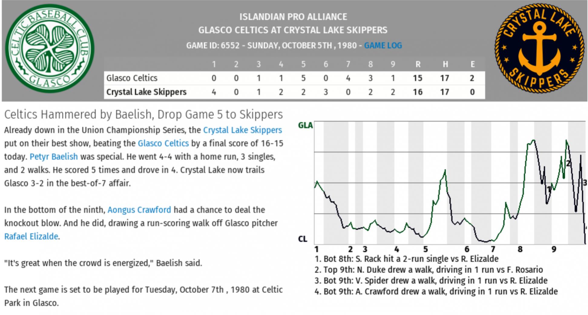 For the first time, the South Fork Stallions have won the pennant. Calemund Holmes pitched a spectacular Game 7, shutting down Colchester's bats and leading the Stallions to the Pro Cup Finals where they will battle the Glasco Celtics. It should be a good one, as both the Stallions and Celtics were the #1 seeds in their respective leagues.  |