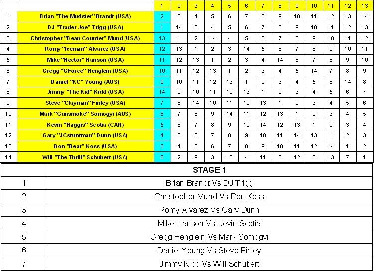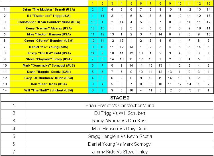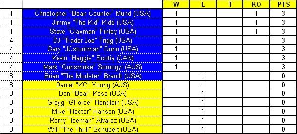 (Just Clic on the link to see the Bout Log) Romy Alvarez vs Gary Dunn Brian Brandt vs Dj Trigg Mike Hanson vs Kevin Scotia Gregg Henglein vs Mark Somogyi Jimmy Kidd vs Will Schubert Christopher Mund vs Don Koss Daniel Young vs Steve Finley THE CURRENT RANKINGS ![]() STAGE 2!!