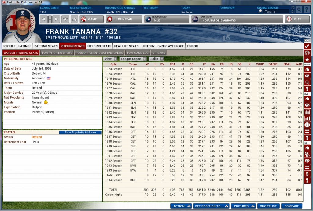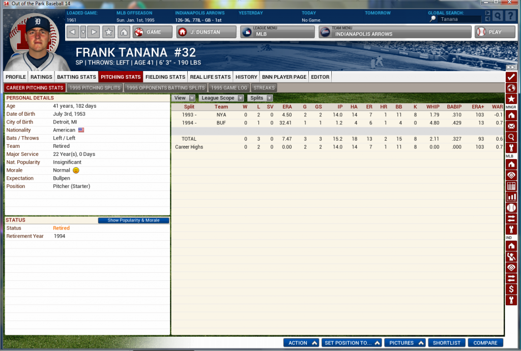 And the final career stats for Mr. Tanana, who retired after the 1994 season. He finished with a winning record, thanks to being the 4th starter for the Buffalo Bisons, who won the NL East with 115 wins, but lost in the NLCS in six games. ![]() He had one NLCS start...it did not go well. ![]() So, pretty much the ultimate "borderline HOF" career, despite 300 wins. Mostly because of the high earnie, and the 300+ losses. |