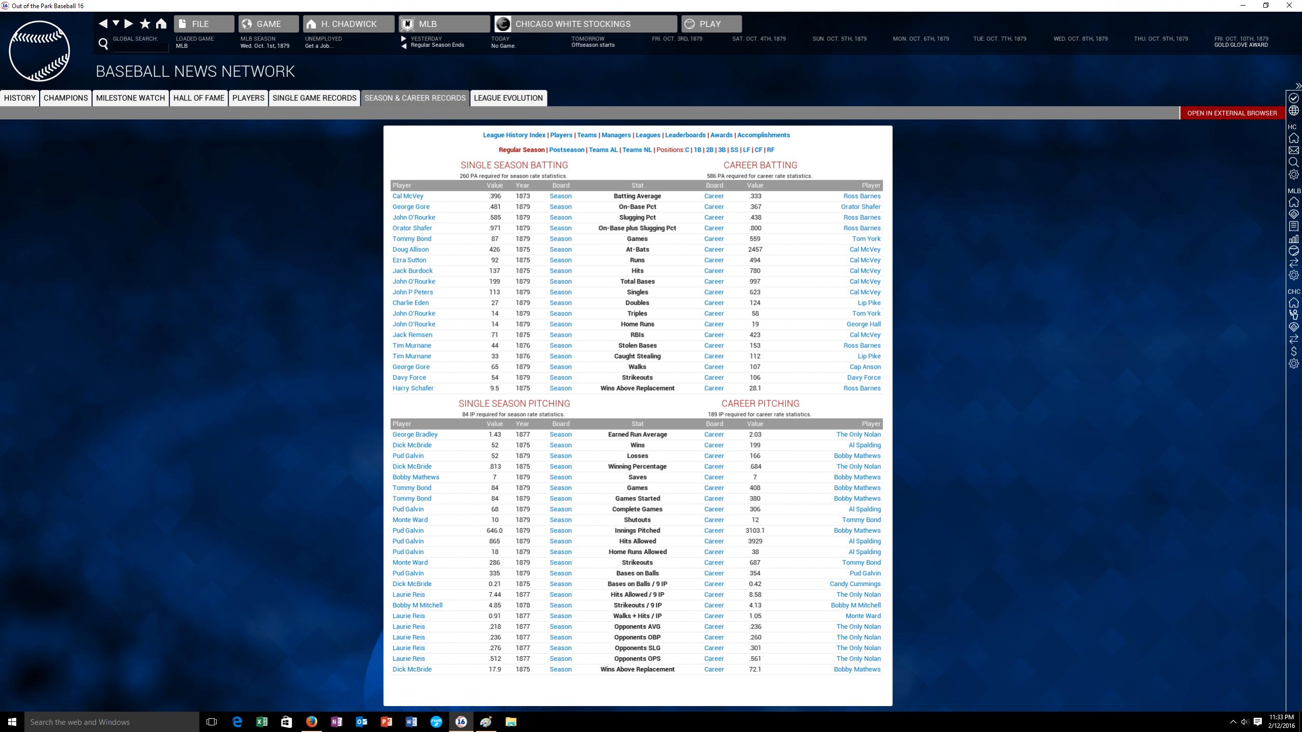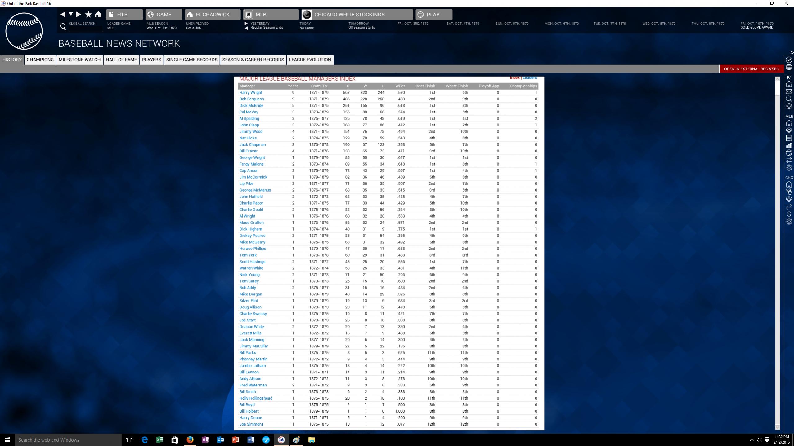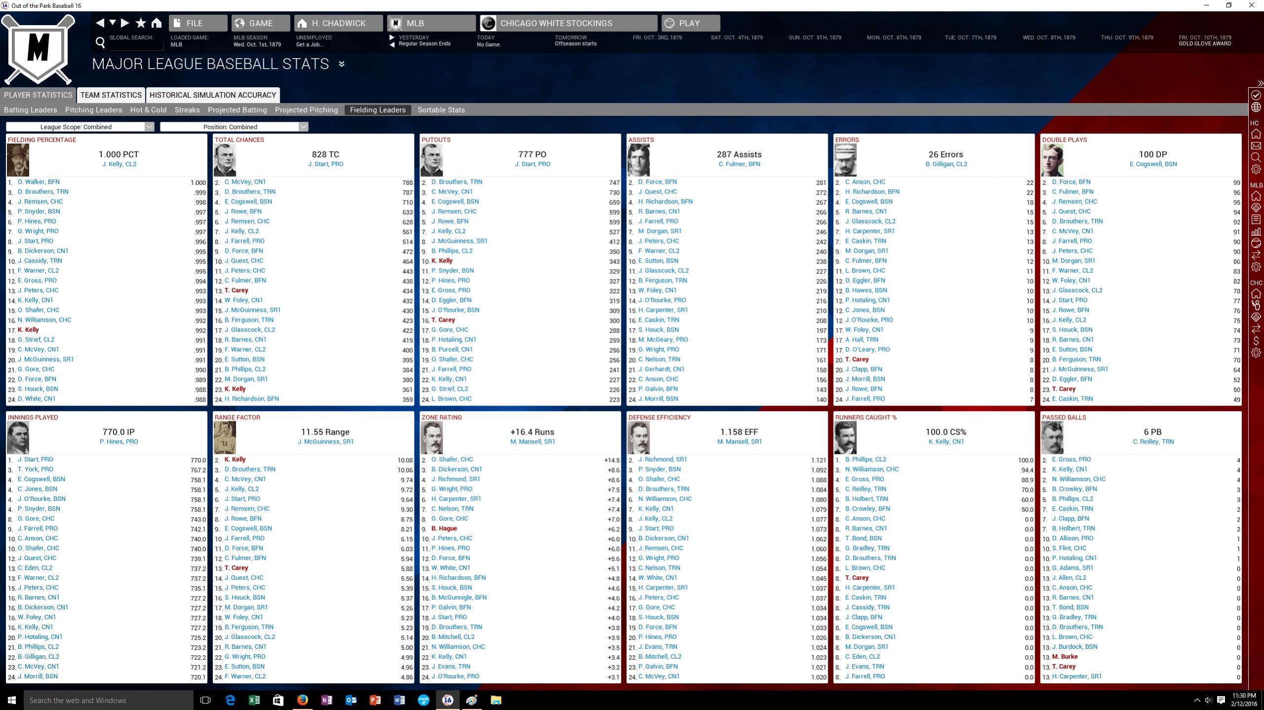 I've played 1871 a million way till Sunday and only the Washington Olympics win. Boston never wins. In 72 New York always wins, Baltimore second and Boston third. Then Boston wins the rest. I have a functional transaction list for the entire National Association. I also have a functional transaction list for the NL from 1876-1882, and a list for the AA in 1882. I'm working on 1883 at the moment. The only thing is you have can't have any computer controlled teams. I have injuries and trades off and players retire as they did IRL. Your seasons are great. Keep posting the results.