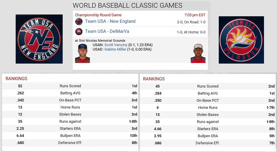 These two teams match up really well as proven by the history they have had over this years and the 2037 tourney. Team USA - DelMarVa will be the home team today going up against Team USA - New England the wild card winner. Both teams will have their aces on the hill with Scott Vanciny going for New England. Vanciny went 7-shutout innings in his start this against DelMarVa striking out 11, allowing 4 hits an walking 5. He alos started against Team USA - East but left hurt after 15 pitches. For DelMarVa we will be throwing Gabino Miller for the 2nd time. He took the ND during a 5-4 win over Team USA - New England during the round-robin, and he won against Team USA - East. Overall he has thrown 15.2 innings, allowing 11 hits and 0 runs, while walking 3 and striking out 14. Both pitchers come in fully rested. Players to watch for Team USA - New England: Max Wallstreet: .333-3-7 Marvin Garrett: .250-3-11 Howard Gray: .286-1-6 Players to watch for Team USA - DelMarVa: Bob Mortin: .381-0-6 Mikel Wallstreet: .333-3-10 Matt Fontenot: .314-1-4 Despite tweaking his back last game Garry Curran is back and ready to go. DelMarVa will be going with the same line-up the did during the semi-finals: LF Gary Curran (S) CF Mookie Wallstreet (L) RF Mikel Wallstreet C Elwood Krause 1B Jimmy Moore (L) 3B Matt Fontenot DH Ira Kelly (wasn't supposed to start, but he is) 2B Melvin Butler SS Bob Morton It is time to play ball!