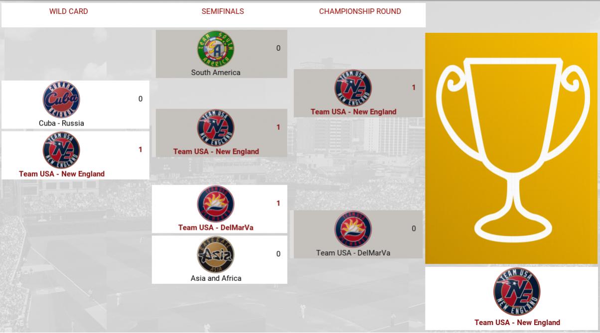 Team USA - New England will avoid the wrath of manager Ken Mitchell and they have a championship trophy to boot. Team USA - New England defeated Team USA - DelMarVa today by the final score of 3-2 in the championship game of the 2039 World Baseball Classic, sending overjoyed players and fans streaming onto the field. "I tried to make sure all the guys knew I would be furious if we screwed this up," Mitchell joked after the game. "I guess that was enough motivation for them."