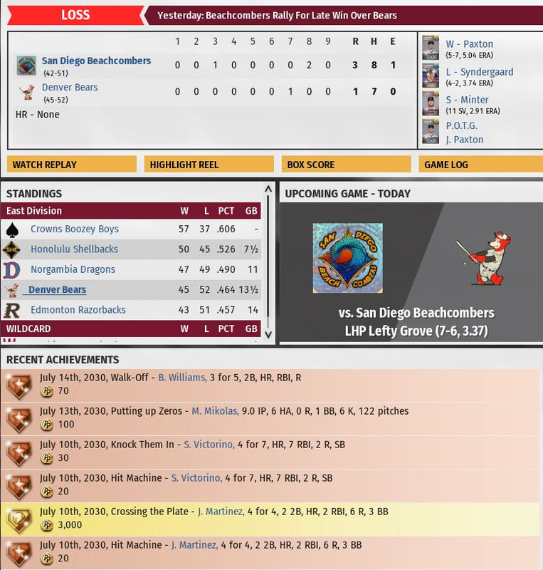 The Beverly Road Geese are struggling mightily in Silver 297. The team is 44-51, in last place in the division. The offense is generally competitive, tied for 3rd in the AC in runs scored, but the pitching staff is a disaster. My starting rotation of Sad Sam Jones (last year’s ERA leader in another Silver league), Patrick Corbin, Larry Dierker, Craig Swan, and Dennis Martinez have the 11th worst ERA in the AC, a combined 4.67. My bullpen is better, at 3.17, but Hugh Casey has an ERA of 6.39 after two very strong seasons in Silver.