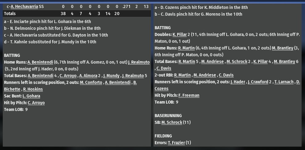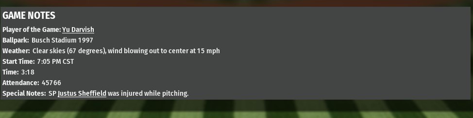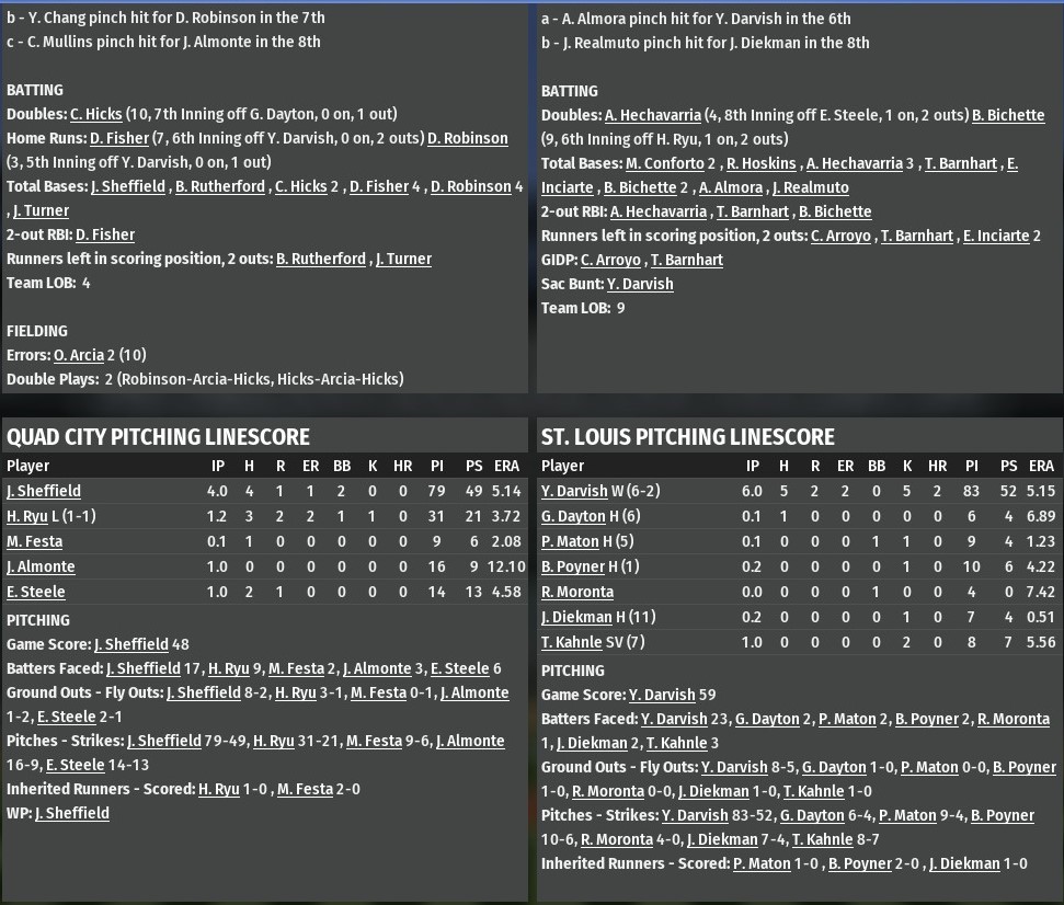 Allen Cordoba led off with a single off St. Louiis starting pitcher Yu Darvish. He stole second, went to third on a sacrifice bunt by Mookie Betts and scored on a Joey Gallo sacrfice fly, as Kansas City took a 1-0 lead and would never trail in a 5-3 win at Busch Stadium (1997). Gallo hit a solo homer off Darvish in the third inning. It's lead down to 2-1, the Pit Masters added two more runs in the fifth on a Brian Mundell homer, also off Darvish. Kansas City added its final run in the seventh after Mookie Betts led off with a single off River Walkers relief pitcher Reyes Moronta. He stole second and moved onto third on a wild throw from catcher J.T. Realmuto. Betts scored when St. Louis second baseman Bo Bichette made a wild throw to first on a ball hit by Willy Adames. Kansas City starting pitcher Shelby Miller allowed one run on six hits over six innings. He struck out two and walked one. Juan Minaya and David Berg kept the Walkers quiet in the seventh and eighth innings, respectively. Drew Anderson recorded all three outs in the ninth for his first save. |