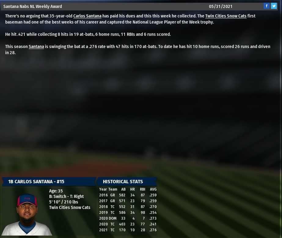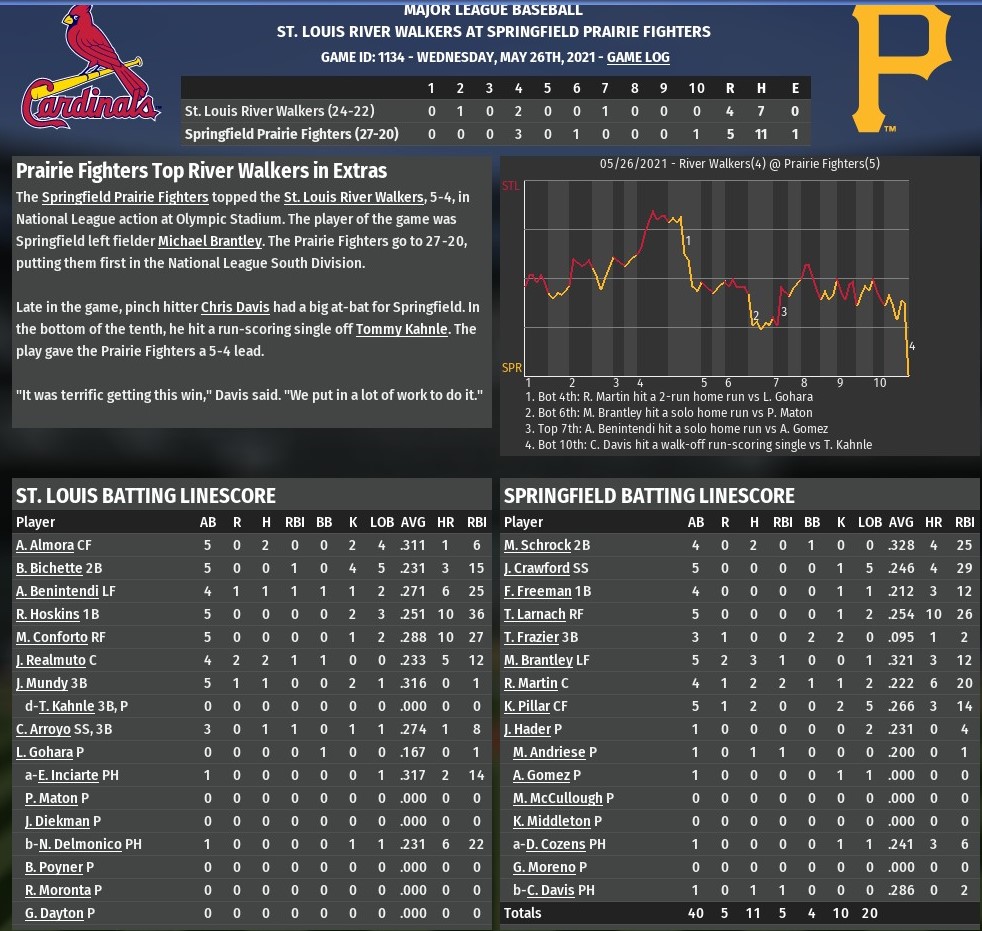 Chris Davis singled off St. Louis reliever Tommy Kahnle with two outs in the bottom of the 10th inning to score Michael Brantley and give Springfield a 5-4 win at Olympic Stadium. With the win, the Prairie Fighters took the final game of three-game series. Brantley had reached with a one-out single off Kahnle. He moved to second when Russell Martin followed with another single. Kahnle struck out Kevin Pillar for the second out, bringing Davis to the plate. A wild pitch moved Brantley to third. Three pitches later, Davis singled past second baseman Bo Bichette to drive in the game-winning run. An RBI single from Christian Arroyo and a run-scoring fielder's choice from Bichette in the fourth inning off Josh Hader gave the River Walkers a 3-0 lead. All of it disappeared in the bottom of the inning. Russell Martin smoked a two-run homer off St. Louis starting pitcher Luiz Gohara. Pillar followed with a double and scored when relier pitcher Matt Andriese coaxed a single to even it. Brantley greeted relief pitcher Phil Maton with a solo homer in the bottom of the sixth, putting Springfield up 4-3. However, the Walkers evened it in the top of the seventh on a solo shot from Andrew Benintendi off Anyelo Gomez. Springfield starter Josh Hader lasted just three innings, giving up three runs on six hits. Six relievers followed him to the mound, with the last of them Gerson Moreno earning the win after pitching scoreless ninth and 10th innings. |
