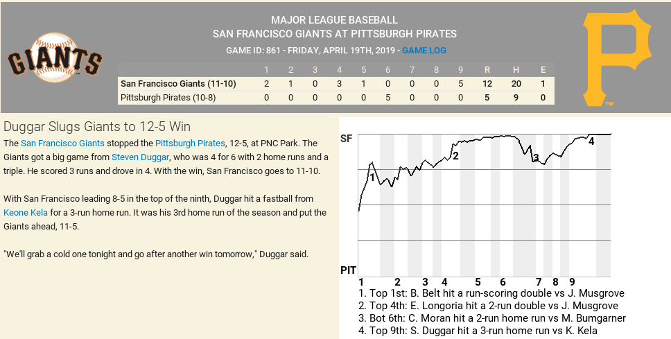 See saw battle that went our way in the end. Pirates got the series win, which is only our 3rd series win out of 6 this month. The Good news is we are 12-8 on the season and we have a lot of offensive good news.