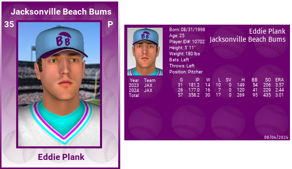 The Jacksonville Beach Bums have improved a lot in 2024 and they triumphed over the Raleigh Spitfires today 4-0 as Eddie Plank dazzled with 16 K's in 8 2/3 innings and allowed just one hit. That hit was by Kirk Gibson. Bunny Hearn came on to get his 37th save of the year as Jacksonville stays 14 games back in the AL Atlantic. Hack Wilson helped out with 3 hits and an RBI.