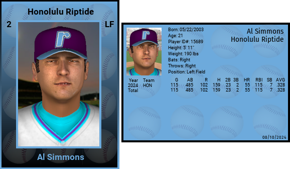 The only news of the day besides some 3 homer games was an exciting game between the Honolulu Riptides and Key West Condors in a battle between idyllic locations. Honolulu won the game 8-6 as Al Simmons goes drives in 5 runs with 2 homers and Chris Singleton went 5 for 5. Simmons now has 55 homers on the 2024 season. At the same time, Boston area actuary and meddler Gary Mendez extend his hitting streak to 25 games with 2 hits and 2 RBI's for Key West. Mendez on his hitting streak "Well you have it... you have it and right now I feel pretty damn good, too bad we lost but we are 130 games into the season and are 66-64 no one could have predicted that.