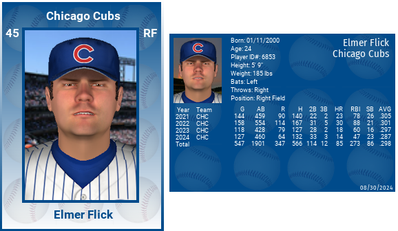 American League - Batter of the Month - Zack Wheat (Houston Astros) - 13 HR 33 RBI .402 avg. Houston is in 2nd place behind the Utah Saints in the AL West by 6 games but lead the wildcard by 2 games over Chicago White Sox and Seattle Mariners and 3 games over Indianapolis Bulldogs. Wheat continues to lead the AL in batting, trying to win another batting title. National League - Batter of the Month - Larry Doby (Cincinnati Reds) - 12 HR 34 RBI's .394. The Reds magic number in the NL Central is 2 games on the Milwaukee Brewers and they are the easy favorite to win the NL this year. Doby is not putting up the unreal numbers of 2023 but he is a dangerous bat regardless American League - Pitcher of the Month - Chief Bender (San Juan Storm) - 5-1 1.33 ERA. San Juan has a 6 game lead in the AL Atlantic over the Baltimore Orioles as they try to win the division again this year. Bender has emerged in 2024 as the ace of this staff. They are looking to have a better postseason than 2023. National League - Pitcher of the Month - Weldon Henley (Riverhead Racers) - 6-0 1.17 ERA. Riverhead has been rolling in the NL East and are 4 games back of the New York Mets for first place. They lead the Milwaukee Brewers by 3 games for top wild card sport out of the 2 spots. They are trying to return to the World Series as they were the unlikely 2023 NL Champions. Henley has been a solid rock over the past 4 seasons for Riverhead. American League - Rookie of the Month - Dick Gernert (Texas Rangers) - 14 HR 30 RBI .309. The Rangers disappointed in 2024 and are almost mathematically eliminated due to a bad first half. Gernert has come on to be a solid addition the highly potent office for this team and gives fans hope for 2025. National League - Rookie of the Month - Jorge Soler (Cincinnati Reds) - 15 HR 39 RBI .333. Soler was always putting up monster numbers in the minors but the Reds had no room for him, they let Stan Javier walk in the offseason which gave Soler a job. It seems he is not having a hard time adapting to big league pitching League Leaders American League Batting Average 1. Zack Wheat (Houston Astros) .374 2. Francisco Lindor (Portland Lions) .346 3. Stan Musial (Anchorage Bears) - .345 Homers 1. Adam LaRoche (San Antonio River Kings) 71 2. Jimmie Hall (Texas Rangers) 61 2. Sherry Magee (Omaha Eagles) 61 RBI's 1. Adam LaRoche (San Antonio Rivers Kings) 174 2. Casey Stengel (Buffalo Bisons) 155 3. Francisco Cabrera (Buffalo Bisons) 153 Stolen Bases 1. Mike Lanning (Indianapolis Bulldogs) 75 2. Farmer Weaver (Charlotte Spiders) 56 3. Mallex Smith (Buffalo Bisons) 55 WAR 1. Francisco Lindor (Portland Lions) 11.5 2. Rogers Hornsby (Detroit Tigers) 9.8 3. Pete Hotaling (Buffalo Bisons) 9.3 Wins 1. Christy Mathewson (Toronto Blue Jays) 21 1. Carl Weilman (Richmond Gamecocks) 21 3. Steve Trout (Detroit Tigers) 20 Strikeouts 1. Christy Mathewson (Toronto Blue Jays) 338 2. Lefty Grove (Richmond Gamecocks) 305 3. Chief Bender (San Juan Storm) 287 ERA 1. Dean Chance (Spokane Gangsters) 1.77 2. Walter Johnson (Fresno Bashers) 1.88 3. Bill George (Cabo San Lucas Black Gold) 1.95 Saves 1. Alex Malloy (Detroit Tigers) 46 2. Fernando Cabrera (Spokane Gangsters) 41 2. Bunny Hearn (Jacksonville Beach Bums) 41 National League Batting Average 1. Fred Dunlap (Newark Thieves) .377 2. Todd Helton (Atlantic City Sharks) .361 3. Bernie Williams (Riverhead Racers) .354 Homers 1. Al Simmons (Honolulu Riptides) 64 2. Lee Walls (Honolulu Riptides) 60 3. Cy Williams (Sacramento Bees) 58 RBI's 1. Jack Smith (Tulsa Rattlers) 162 2. Cy Williams (Sacramento Bees) 158 3. Danny Santana (Las Vegas Snake Eyes) 136 Stolen Bases 1. Billy Hamilton (Vancouver Men-O-War) 68 2. Jimmy Rollins (Sarasota Typhoon) 54 3. Lenny Dykstra (Boise Parrots) - 51 WAR 1. Fred Dunlap (Newark Thieves) 10.9 2. Todd Helton (Atlantic City Sharks) 9.7 3. Jack Smith (Tulsa Rattlers) 9.3 Wins 1. Bill Sowders (Philadelphia Phillies) 22 2. Brownie Foreman (Tulsa Rattlers) 21 3. Jack Harshman (Los Angeles Dodgers) 20 Strikeouts 1. Bobby Mitchell (Atlanta Braves) 324 2. Noodles Hahn (Colorado Rockies) 317 3. Brownie Foreman (Tulsa Rattlers) 314 ERA 1. Bobby Mitchell (Atlanta Braves) 1.34 2. Bob Feller (Chicago Cubs) 1.60 3. Noodles Hahn (Colorado Rockies) 1.82 Saves 1. Ralph Comstock (Arizona Diamondbacks) 43 2. Andrew Bailey (New Orleans Zebras) 41 2. Paul Masterson (Tulsa Rattlers) 41 |