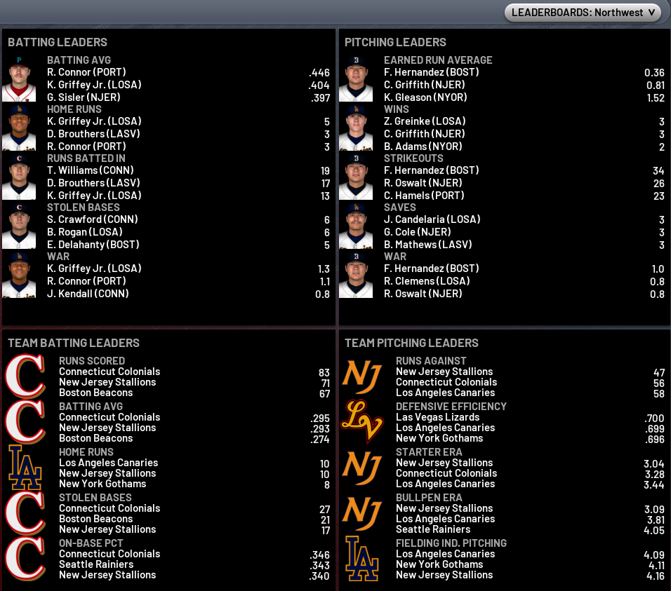 Northwest League Roger Connor (Portland): .500 / 3 HR / 6 RBI Southeast League Ken Boyer (New Orleans): .571 / 2 HR / 5 RBI