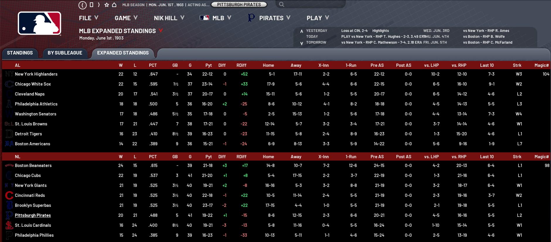 TRADE 1 OF 5: (06/03): 2B Jimmy Williams and RP Lave Winham to New York for IF Charlie Hickman. I just felt this was a bit of a twofer, not just swapping out a patchy hitter whose numbers have dropped each season for a more consistent one, but also one that helps us defensively, allowing Murphy to move to his more familiar 2B and Charlie to man first. He can also play the other three IF slots with varying degrees of skill as well as OF. I certainly feel it makes us a better club moving forward, especially given the attitudinal issues of Jimmy’s I have spoken about. It certainly has the desired effect, as we put together a pair of good wins not long after, beating the Beaneaters 8-3 and 12-1 in successive games to stick our noses above 500. In the second of those games, Wagner has five hits and Hickman goes deep for the first time this year. We slowly drag ourselves up the standings with a 7-3 run in mid-month and some good signs are definitely creeping into our play. One of these is a 13-0 hammering of Brooklyn in which Chesbro pitches a five-hitter and Wagner goes yard twice to continue his outstanding year. Seybold, who also homers in this one, is working so hard to turn it around and I feel confident a breakthrough in that regard is imminent. But we are still way too inconsistent, as our 3-0 shutout loss the day after that blowout is testament to, as we collect just three hits and look as impotent as impotent can be. The pack bunches right up over this period as the Beaneaters lose six on the trot and the peloton reels them in. We go into a four-game swing against them just two back and therefore within reach. Instead, we drop three from four and head back into mid-standings no man’s land. The last of these games, a poor 8-1 loss, finally forces my hand as O’Neill is banished to the pen, with McJames moved up to SP3 and Owen in as the spot starter. We continue our spotty form right thru the end of the month and finish – almost as if in a deliberate effort to highlight our middle-of-the-road status – at 33-33, six games off the pace. Hot