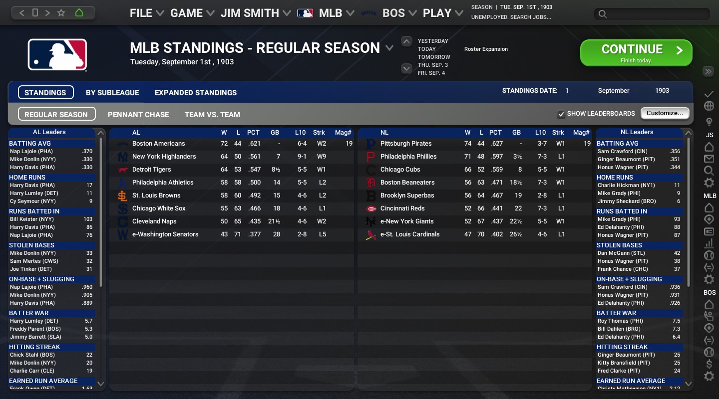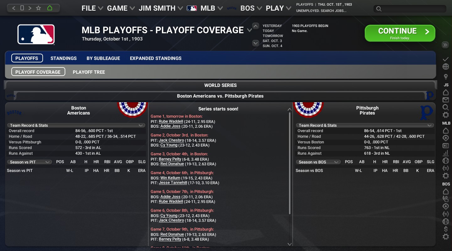 -AL Best Batter award: 2B Nap Lajole of the Philadelphia Athletics with 10 home runs, 92 RBIs, and 108 runs scored. -NL Best Batter award: CF Ginger Beaumont of the Pittsburgh Pirates with 5 home runs, 89 RBIs, and 105 runs scored. Awards for September LF Mike Donlin of the New York Highlanders wins the AL Batter of the Month Award with 3 home runs, 15 RBIs, and 23 runs scored. 1B Charlie Hickman of the New York Giants wins the NL Batter of the Month Award with 3 home runs, 21 RBIs, and 16 runs scored. SP Gus Dorner of the Cleveland Naps wins the AL Pitcher of the Month Award with a 5-1 record, 1.24 ERA, and 18 strikeouts. SP Rube Waddell of the Pittsburgh Pirates wins the NL Pitcher of the Month Award with a 6-0 record, 1.09 ERA, and 57 strikeouts. SP Gus Thompson of the Philadelphia Athletics wins the AL Rookie of the Month Award with a 4-1 record, 1.10 ERA, and 23 strikeouts. SP Norwood Gibson of the St. Louis Cardinals wins the NL Rookie of the Month Award with a 3-0 record, 1.05 ERA, and 10 strikeouts. The 1903 World Series matchup will be a rematch of 1901, with the Boston Americans (84-56) facing the Pittsburgh Pirates (86-54)!!! |