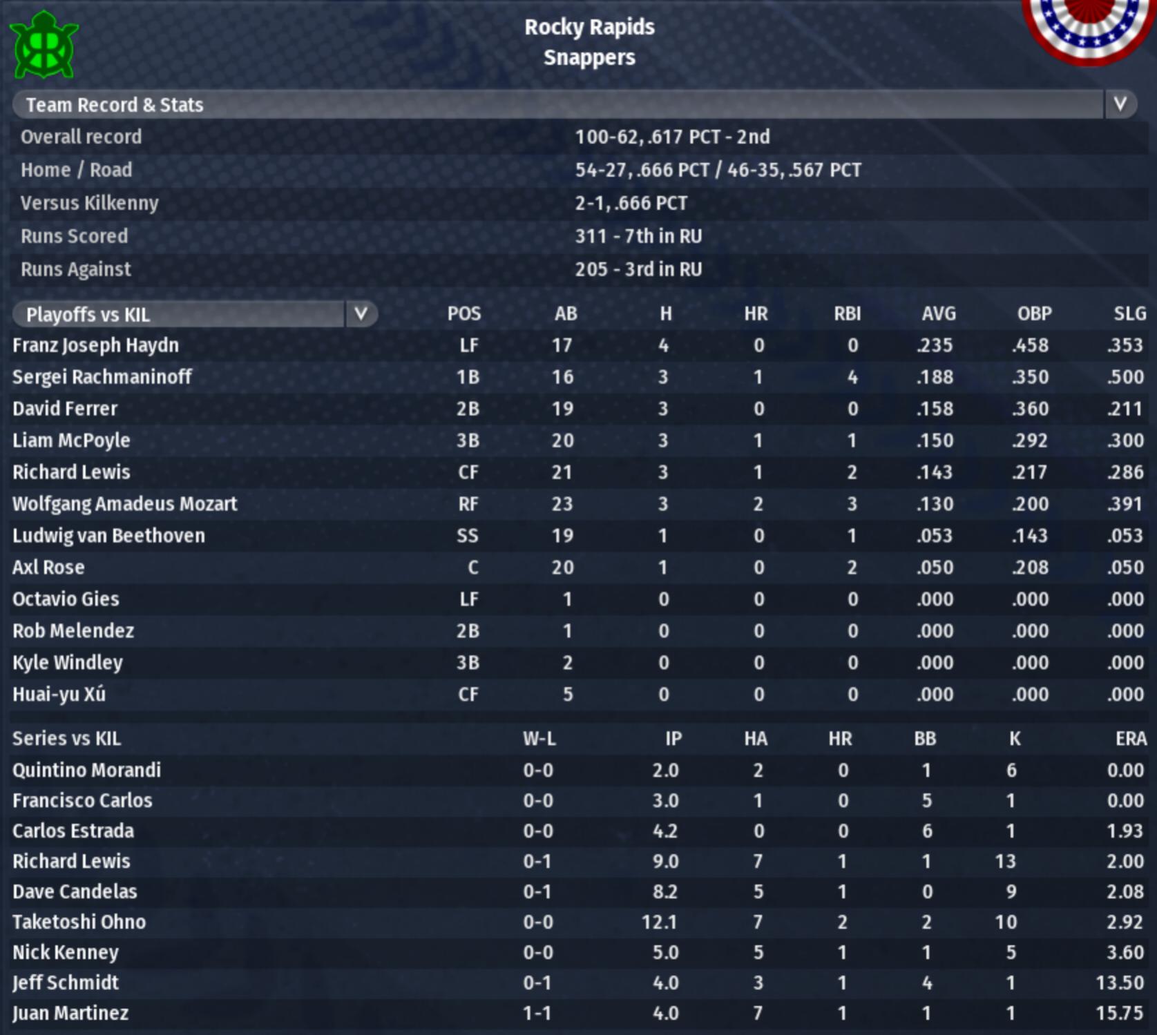 Ruthlandian Union Belle Plaine Musketeers (93-69) vs. Kilkenny Hops (94-68) Union Heights Hackers (94-68) vs. Colortown Parrots (107-55) Tycobbian Union Colchester Elites (107-55) vs. South Fork Stallions (111-51) Oxford Red Caps (109-53) vs. Cape Coral Hurricanes (111-51) |