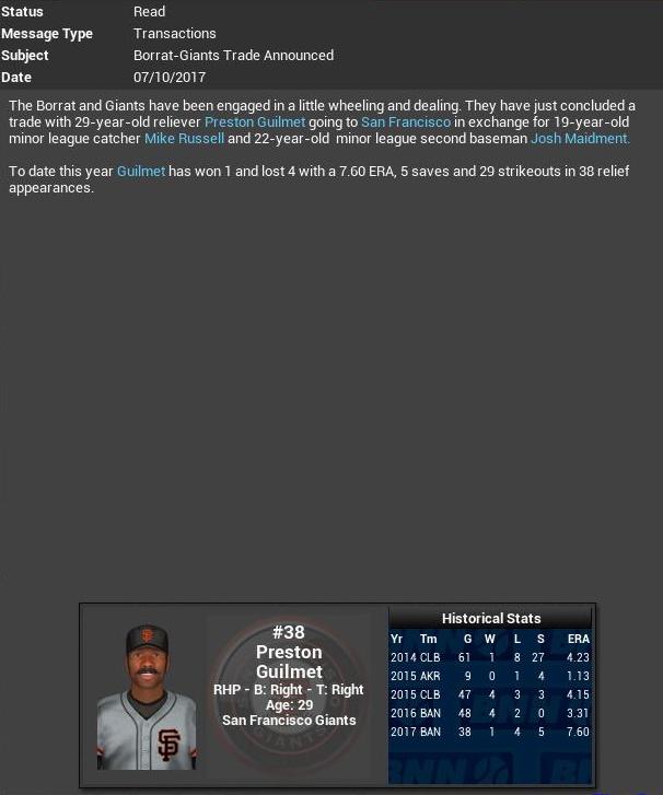 The Mets who already lead the NL East should go deep in the playoffs. Brett Scott-Bremer & Lamont Morris will be traded when Brett comes off the DL. Stan Pearl & Nicky Lee will be traded when Pearl comes off of the DL. I'll shop other FA to be around.