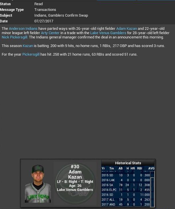 Traded RF Adam Kazan & minor league LF Arty Center to Lake Venus for Pickersgill.