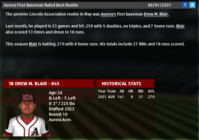 Aurora 1b Drew M. Blair is named LA ROTM. Normal C Dennis Malmin is named DA ROTM. Atlantis will miss SS Joe Parks for 3 weeks. Chevy loses 3b Greg Lacky for 12 months.
