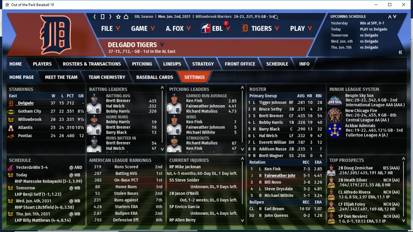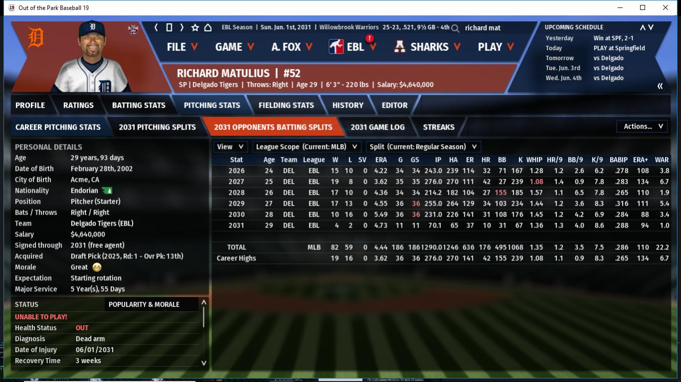We are 2-1 vs Delgado this season. Nothing bad i can say about this team. The road for the AL East goes thru them and they look to be in great shape to win the AL pennant. They are a bit banged up right now, which can benefit us. Cf John Studs will take over vs RHP vs Raphael Coffey. With Bostic down PAC will start vs LHP for now at SS but Wilson & Duncan will also see more AB's as PAC is not hitting very well but he is a Gold Glove caliber dfender and has ++ speed.