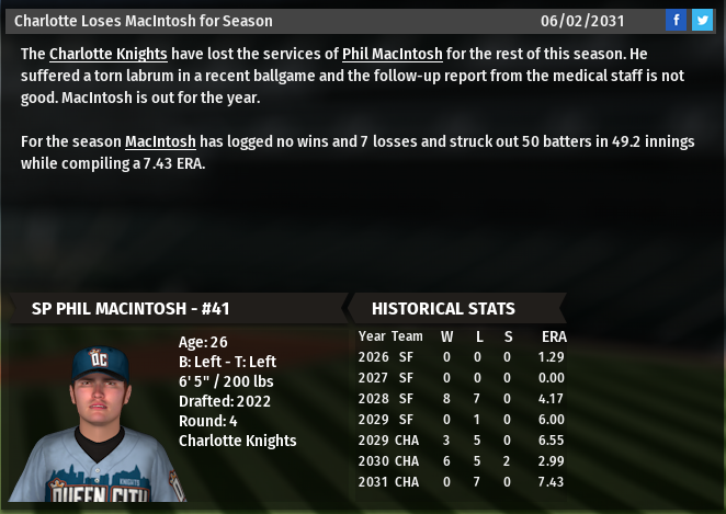 Charlotte CF Captain America is named MLB AL POTW.Knights lose SP Phil MacIntosh for the season.
