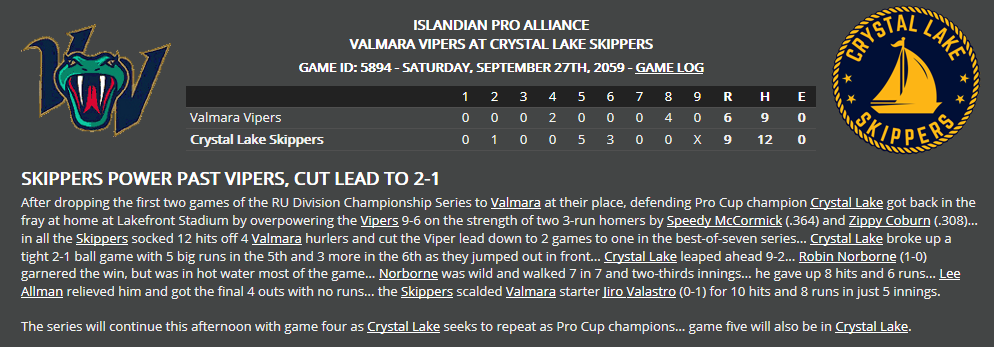 Thursday, October 2, 2059 VALMARA AND GINZA ADVANCE TO LEAGUE FINALS In seventh-game showdowns, the Valmara Vipers crushed and sunk the repeat hopes of the Crystal Lake Skippers for back-to-back Pro Cup trophies... and the darlings of the IPA playoffs, the Ginza Ninjas, surprised powerhouse Oxford and sent them packing from the postseason. The potent Vipers, now the highest-rated club left in the Pro Cup playoffs, got a stunning comeback 9-6 victory over the Skippers to advance to the Ruthlandian Union title series against the seventh-ranked Sligo Rovers, who upset top-ranked Marston in first round action... Valmara was the second choice to win the Pro Cup trophy this year... and it will be the number eight choice, the unheralded Ginza Ninjas, better known these days as the Karate Kids, taking on the number-three rated team, the strong High Mesa Mustangs in the Tycobbian Union title series... the Ninjas whipped the Red Caps 4-1 to cop the series four games to three... they came back from a 3-2 deficit by capturing the last two games of the series. 2059 Ruthlandian Union Division Championship Series - Game 7 Click on Line Score to Enlarge Last edited by Eugene Church; 03-20-2019 at 06:10 PM. |