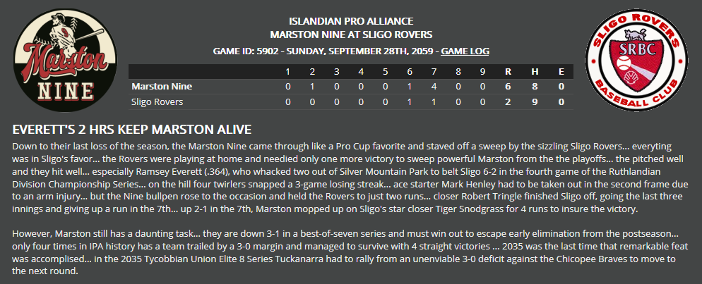 Monday, September 29, 2059 3 TEAMS HANGIN' ON, SKIPS IN TROUBLE Three teams are rolling in the clover and three are just barely hangin' on to the edge of the proverbial cliff in the perilous Islandian Pro Alliance Pro Cup playoffs... Sligo, Valmara and High Mesa have huge 3-1 leads in their series, while Pro Cup favorite Marston, last year's Pro Cup winner Crystal Lake and Denton City are very much in peril of elimination... to stay in the postseason playoffs the latter trio will have to do the almost impossible... they will have to win four consecutive games to advance to the League Championship round... this has rarely happened in IPA circles... only four times has this transpired. In 2001, Ginza did it in the first round of play... in 2009 Pro Cup champion Turon amazingly triumphed in the Pro Cup Finals... in 2015 Bay St. Clair turned it around in the opening round... and most recently in the 2035 Tycobbian Elite 8 Series, Tuckanarra rallied from a 3-0 deficit to move to the next round. In Sunday's action, Marston mopped up on Sligo 6-2... Valmara lambasted Crystal Lake 12-7... and Denton City got new life with a 3-2 win in 10 innings over High Mesa... in the other series Oxford has its hands full with the Ginza Ninjas... they have split four games this far... the Ninjas nudged out the Red Caps 4-3 to tie it up at two games apiece. 2059 Ruthlandian Union Division Championship Series - Game 4 Last edited by Eugene Church; 03-16-2019 at 07:13 PM. |