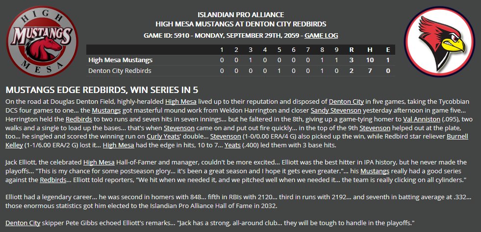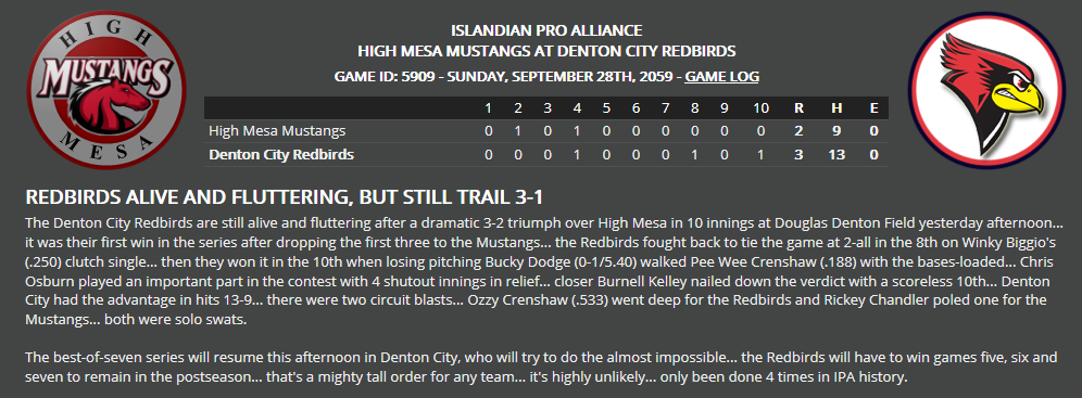 Tuesday, September 30, 2059 SLIGO, HIGH MESA ADVANCE TO LEAGUE FINALS High Mesa its first-round series as expected and Sligo unexpectedly won its first-round series... they both captured a spot in their league finals with victories in 5 games... the Mustangs edged Denton City 3-2 to eliminate the Redbirds from the playoffs, while the Sligo Rovers stunned mighty Marston 3-2 to wrapup that series... the Nine were rated the favorite to take the Pro Cup trophy this year by the baseball experts... the Rovers were picked number 7 out of the 8 teams. VIPERS AND RED CAPS UP BY A GAME 3-2 In other action, last year's Pro Cup champion Crystal Lake nipped Valmara 6-5 to keep their hopes for back-to-back Pro Cup trophies... but they still trail the Vipers three games to two with both of the remaining games on Valmara's home diamond... in the only other postseason game Oxford made quick work of the Ginza Ninjas 7-0 to go one-up in that series, three games to two. 2059 Ruthlandian Union Division Championship Series - Game 5 Click on Line Scores to Enlarge Last edited by Eugene Church; 03-17-2019 at 06:30 PM. |