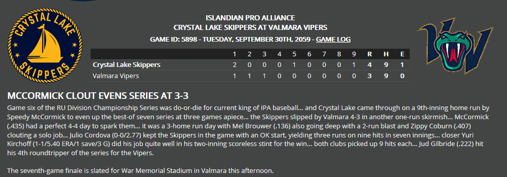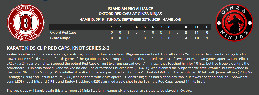 Wednesday, October 1, 2059 SKIPS, NINJAS FORCE 7TH GAME It a baseball fan's delight... the 7th game of a playoff series... and you get two of them on the same day... reigning Pro Cup winner Crystal Lake is trying real hard to repeat again as IPA champion... yesterday they fought off elimination again with another 4-3 squeaker over the Valmare Vipers in the Ruthlandian Union first round... and the upstart Ginza Ninjas did the same thing in the Tycobbian Union... the Karate Kids blitzed the highly-rated Oxford Red Caps 7-0 to tie their best-of-seven series at three games each... both seventh-game finales will be played this afternoon. Ruthlandian Union Division Championship Series - Game 6 Click on Line Score to Enlarge |