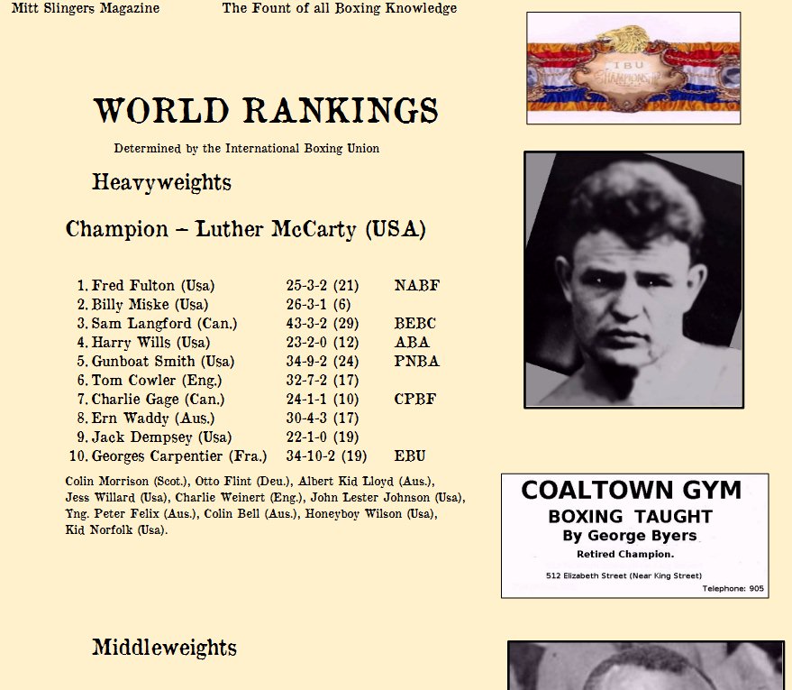 The IBU declares Harry Wills to be their number one contender for the title held by Luther McCarty and will press McCarty to defend against Wills this year. At a similar meeting of the North American Boxing Federation Billy Miske is designated the top challenger for champion Fred Fulton after Miske and his manager lodge an official challenge with the board. Fulton is told he must defend his title within six months...