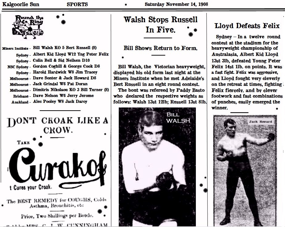 Excerpts from The Kalgoorlie Sun November 1908...At the Sydney Stadium last night the contest for the heavyweight championship of Australia and New Zealand, between Albert Kid Lloyd (holder of the title) and Young Peter Felix took place. The announced weights were Lloyd 13st 3lbs.; Felix 14st 1lb. Although Felix put up a good stoush, it really was for the most part, a fairly one-sided victory for Lloyd. Most credit the Queenslander with at least three of the twelve rounds, but he was well out-boxed by the champion. Lloyd was exceedingly fast, and often during the early part of the battle his footwork got him out of awkward positions. There was a side wager of £100 and about 10,000 persons were in attendance. Of the "gate" Lloyd received 30 percent, Felix having agreed to 15 percent...Colin Bell and Sid Neilsen furnished the semi windup last evening, with Bell a slight favourite with the crowd going in. They gave the mob a great exhibition of fighting fury and both are to be congratulated upon their gameness under the give and take of punishment. Bell seemed to fade at the very end, and was forced to take a count on one knee, but rose to deliver awful whacks to Neilsen's body that would have cooked a camel. When time was called with both men on their feet, Arthur Scott declared it a draw and few could complain...At Melbourne's Crystal Palace former champion Jack Howard overcame an early lead by Dave Sonter to earn a draw and the applause of the crowd. It was probably a last minute knockdown of Sonter that closed the gap on points for Howard...Seven hundred followers of the fistic science witnessed the closing chapter of Bill Turner's ring career at Victoria Hall when Dimitris Nikolaou, one-time Greek merchant sailor, ended things in three furious rounds Thursday night. Only Turner's bullish strength enabled him to last even that long. In the only preliminary Melbourne's Pat Doran lost a six round decision to newcomer Jack Grindal and apologized to his supporters from the ring...New Zealand's Alec Pooley pleased the home folk at Auckland Arena taking a convincing decision after eight rounds with Jack Darcy the Sydney pugilist. A loss would have dropped Pooley from the ANZBF top ten ranks and the paydays that go with it...An overseas cable informs us that Ern Waddy sent Jack Johnson back into retirement with an eighth round knockout at Chicago's Tattersall's Arena. A left to the body followed by a right uppercut to the jaw proved to be the finisher. Johnson weighed in at nearly 17 stone...