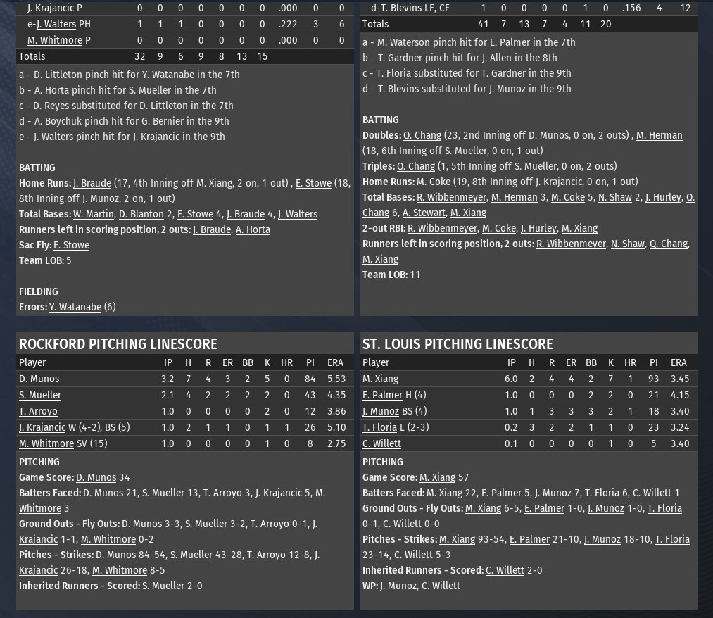 In his first year with the Walkers, the 27-year-old Floria is now a three-time All-Star having made it the previous two seasons while with the Louisville Sluggers. This season, Floria has appeared in 26 games going 2-3 with 14 saves and a 2.93 ERA. He has pitched 27.2 innings, during which he has struck out 36 and posted a 1.37 WHIP. Floria has one blown save. This will be the second All-Star game for the 27-year-old Herman, who also made it in 2038. In 2040, Herman has hit .300 with eight homers and 37 RBIs in 90 games/82 starts. He has scored 47 runs while getting on base at a .382 clip and slugging .454. |