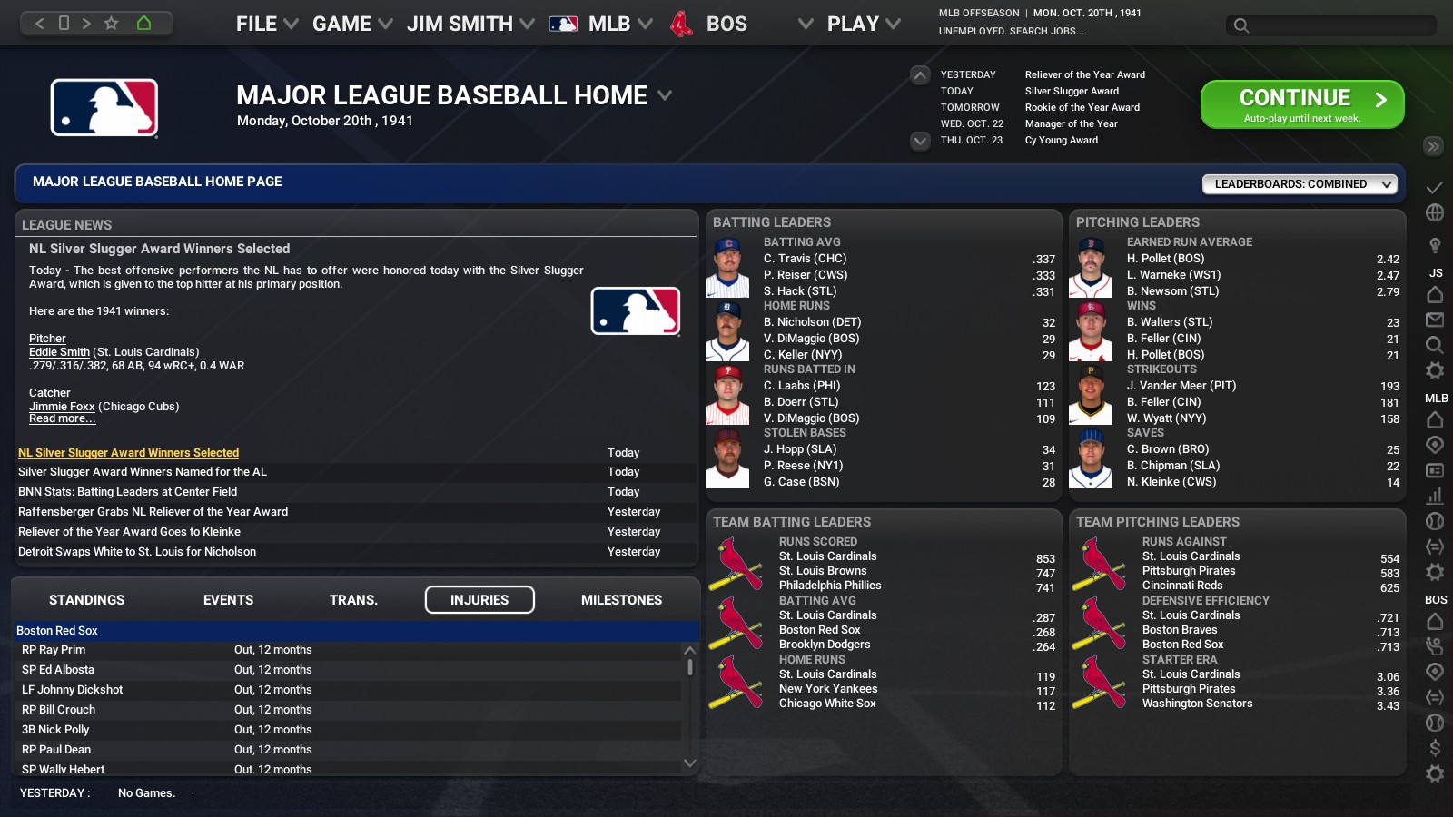 3B Ken Keltner of the Detroit Tigers wins the AL Batter of the Month Award. LF Ted Williams of the Cincinnati Reds wins the NL Batter of the Month Award. SP Howie Pollet of the Boston Red Sox wins the AL Pitcher of the Month Award. SP Cliff Melton of the Cincinnati Reds wins the NL Pitcher of the Month Award. SP Howie Pollet of the Boston Red Sox wins the AL Rookie of the Month Award. RF Stan Musial of the Brooklyn Dodgers wins the NL Rookie of the Month Award. The 1941 World Series has been determined, and its an all-St. Louis matchup, with the St. Louis Browns (84-70) vs. the St. Louis Cardinals (105-49)!!! Last edited by Lord Byron; 03-31-2024 at 10:16 PM. |