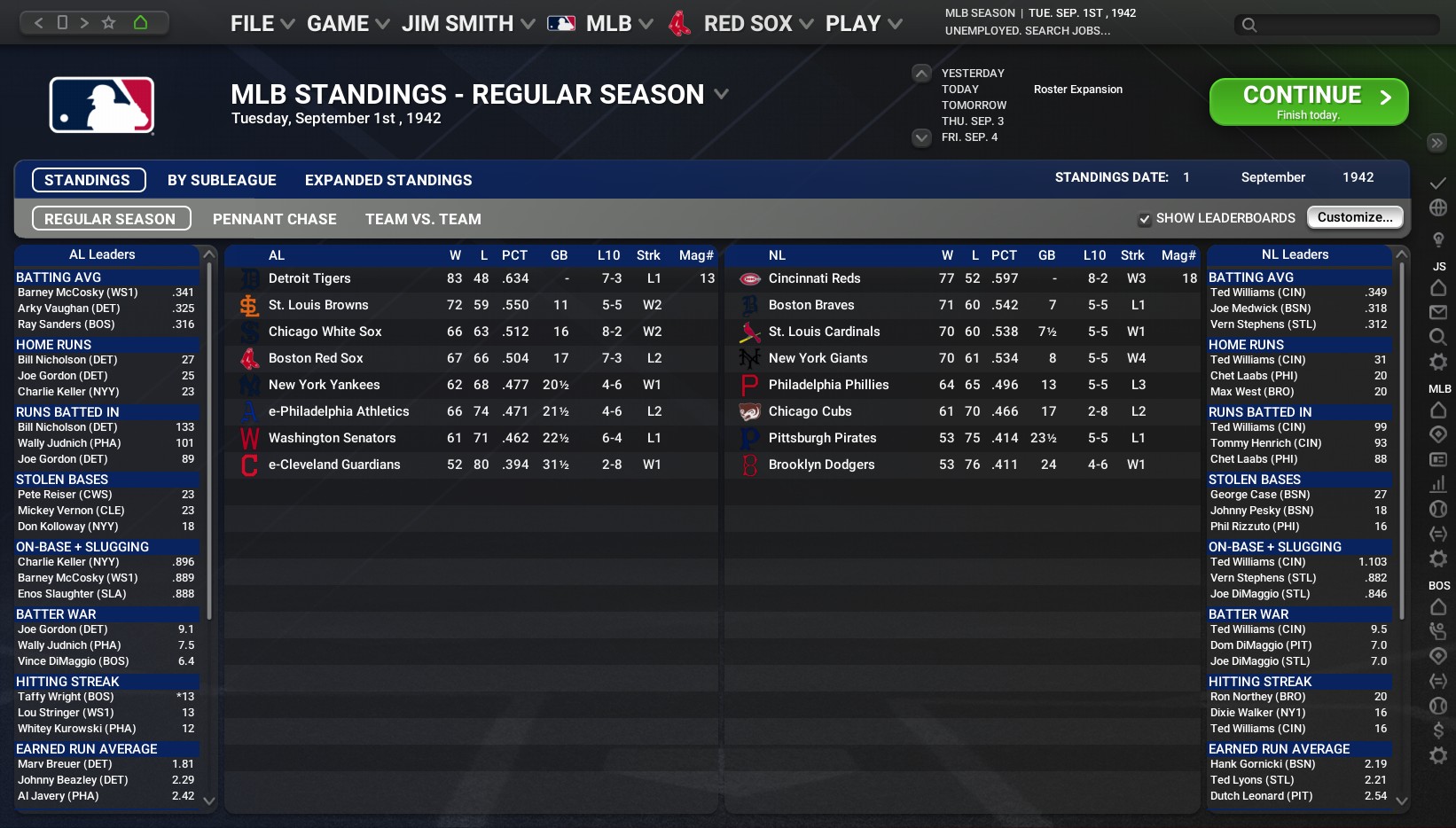 CF Vince DiMaggio of the Boston Red Sox wins the AL Batter of the Month Award. LF Ted Williams of the Cincinnati Reds wins the NL Batter of the Month Award. SP Max Lanier of the St. Louis Browns wins the AL Pitcher of the Month Award. SP Early Wynn of the New York Giants wins the NL Pitcher of the Month Award. SP Hank Borowy of the Detroit Tigers wins the AL Rookie of the Month Award. SP Jesse Flores of the Boston Braves wins the NL Rookie of the Month Award. First-place teams AL: Detroit Tigers (83-4811 games ahead of the St. Louis Browns) NL: Cincinnati Reds (77-527 games ahead of the Boston Braves) |
