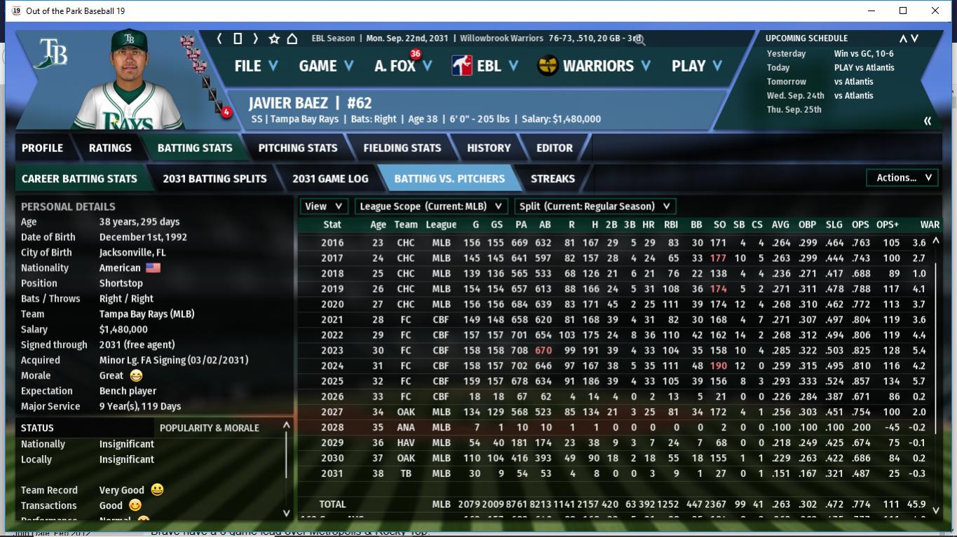 We are 7-11 vs Atlantis this season. We are tied with Atlantis, who have been playing poorly as of late, while we are doing better as of late. We are benefitted by being at home were we are 12 games over .500, while Atlantis is on;y 1 game over. We have played poorly vs them regardless and we need to take 2 out 3 or a sweep. We are 11 games under on the road and our final games are all road games. I have been using Benji Self as a DH as of late and he has done well hitting .300 3-10 with 2 3b and 4 RBI.