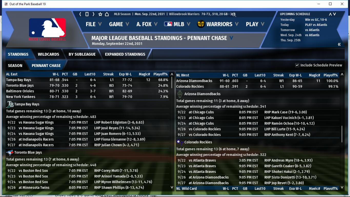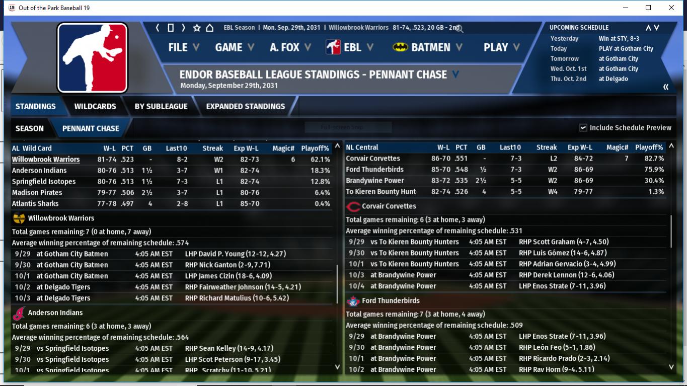 The AL Wildcard rtace is heating up. While Anderson is maintaining a lead, Willowbrook, Madison & Atlantis are all 1.5 games back with the Isotopes, Falcons & Firebirds all within 5 games.