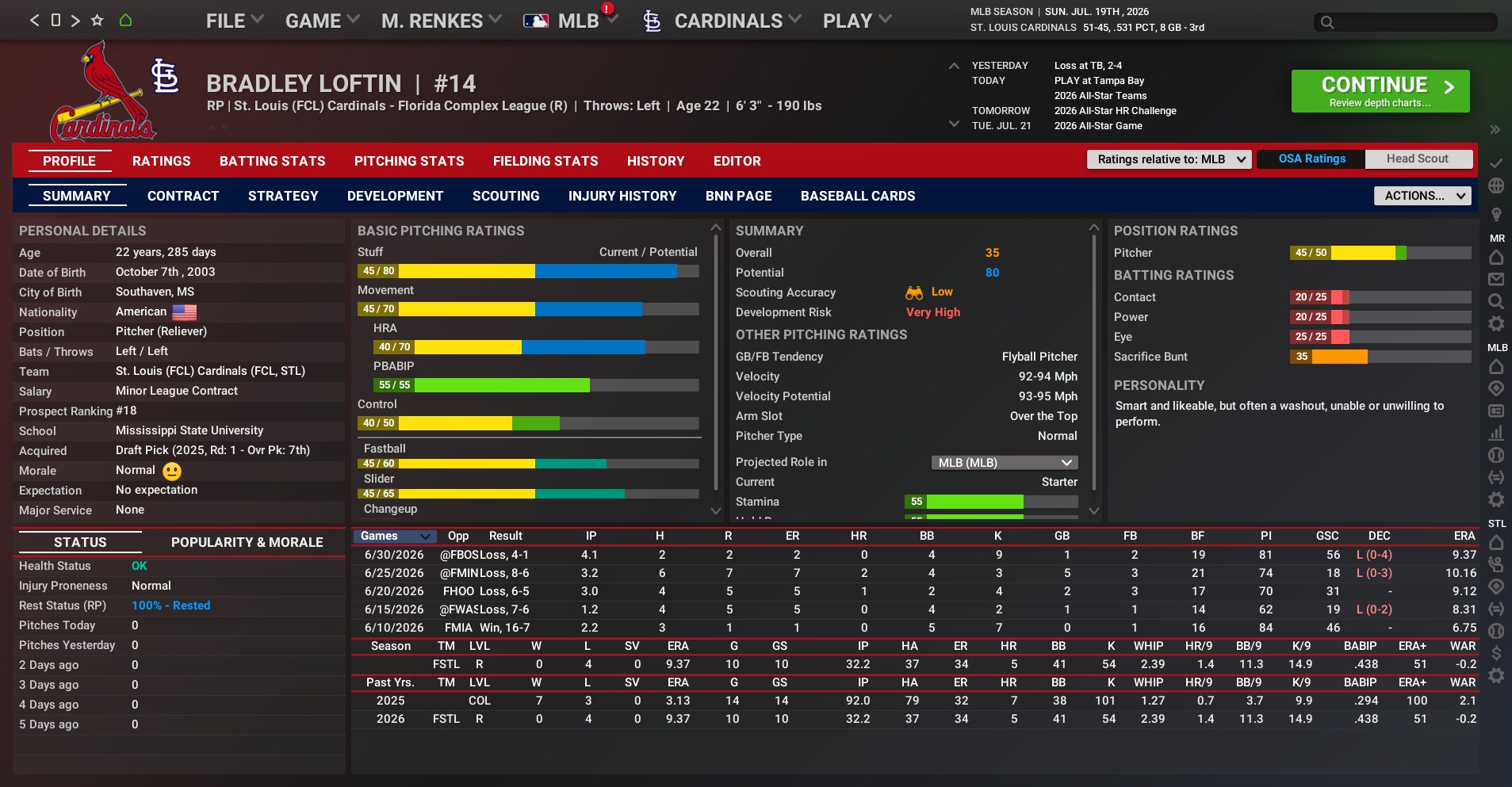 Infielder Boston Baro, starting pitcher Bradley Loftin and relief pitcher Zach Showalter have been named to the National League roster for the Prospects Game. Acquired in an off-season trade with the Mets, 21, Baro has had an impressive season at AAA Memphis where in 89 games/87 starts, he has batted .319 with 12 home runs, 52 RBIs and 59 runs scored. The sixth-overall pick in the 2025 MLB draft by St. Louis, Loftin, 22, has gone 0-4 with a 9.37 ERA in 10 starts for the Cardinals Rookie League team in the Florida Gulf Coast League. The right-hander has pitched 32.2 innings, during which he has struck out 54 and posted a 2.39 WHIP. Showalter, 22, is the closer for the same team. In 19 games, he is 0-1 with 13 saves and a 2.20 ERA. He has pitched 16.1 innings, during which he has struck out 24 and has a 1.84 WHIP. |
