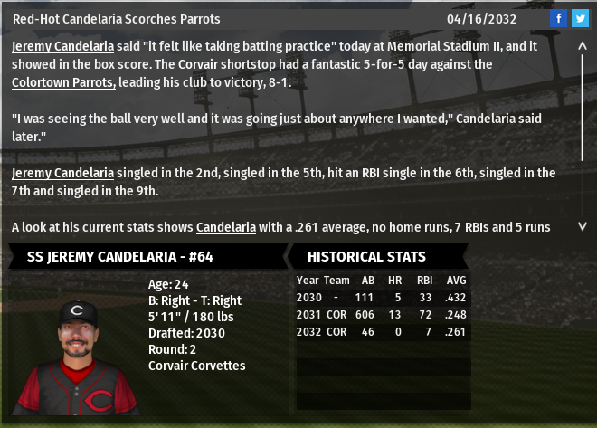 Las Vegas SP Sammy Bodean pitched a 3 Hit 7 k CG SH. Lake Venus loses RP Isak Halse for the season. Cleveland RF Joaquin Robles is named MLB AL POTW. San Diego LF Navicula is named NL POTW.