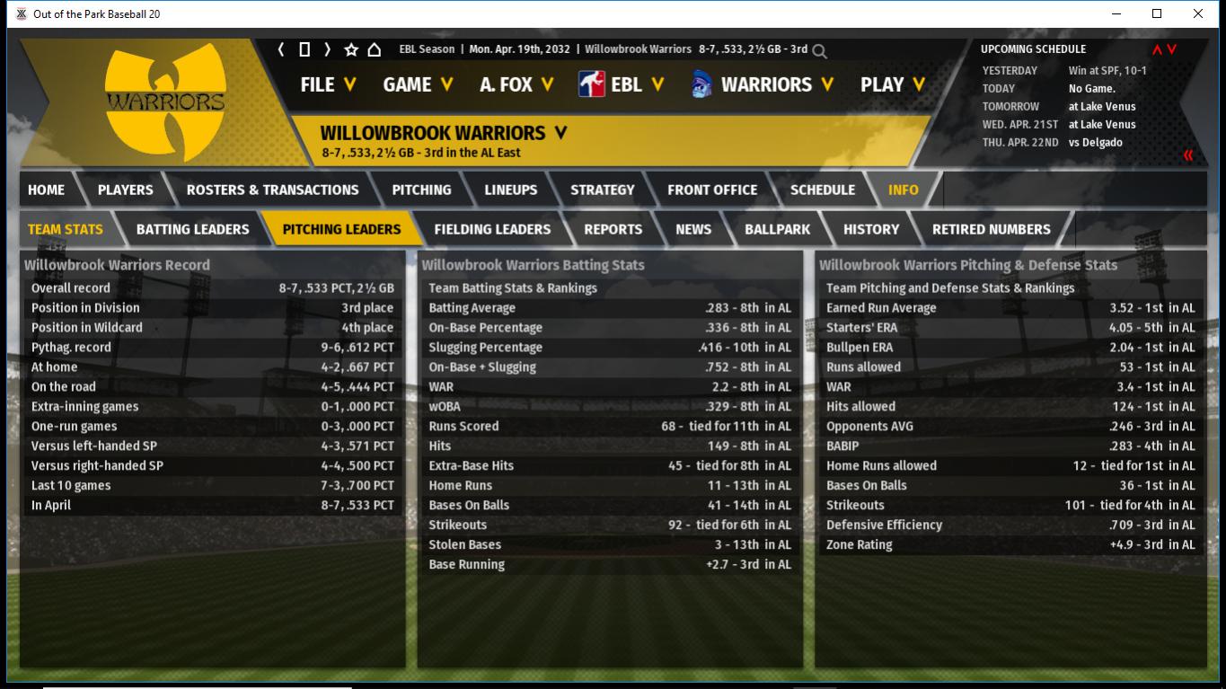 Brave & Rockies got off to a hot start in the NL East, while Paradise City & Glenbard are fighting for the division lead in the NL West early on. Brandywine is trying to put some distance between them and the other 3 great teams in the NL Central before they get hot.
