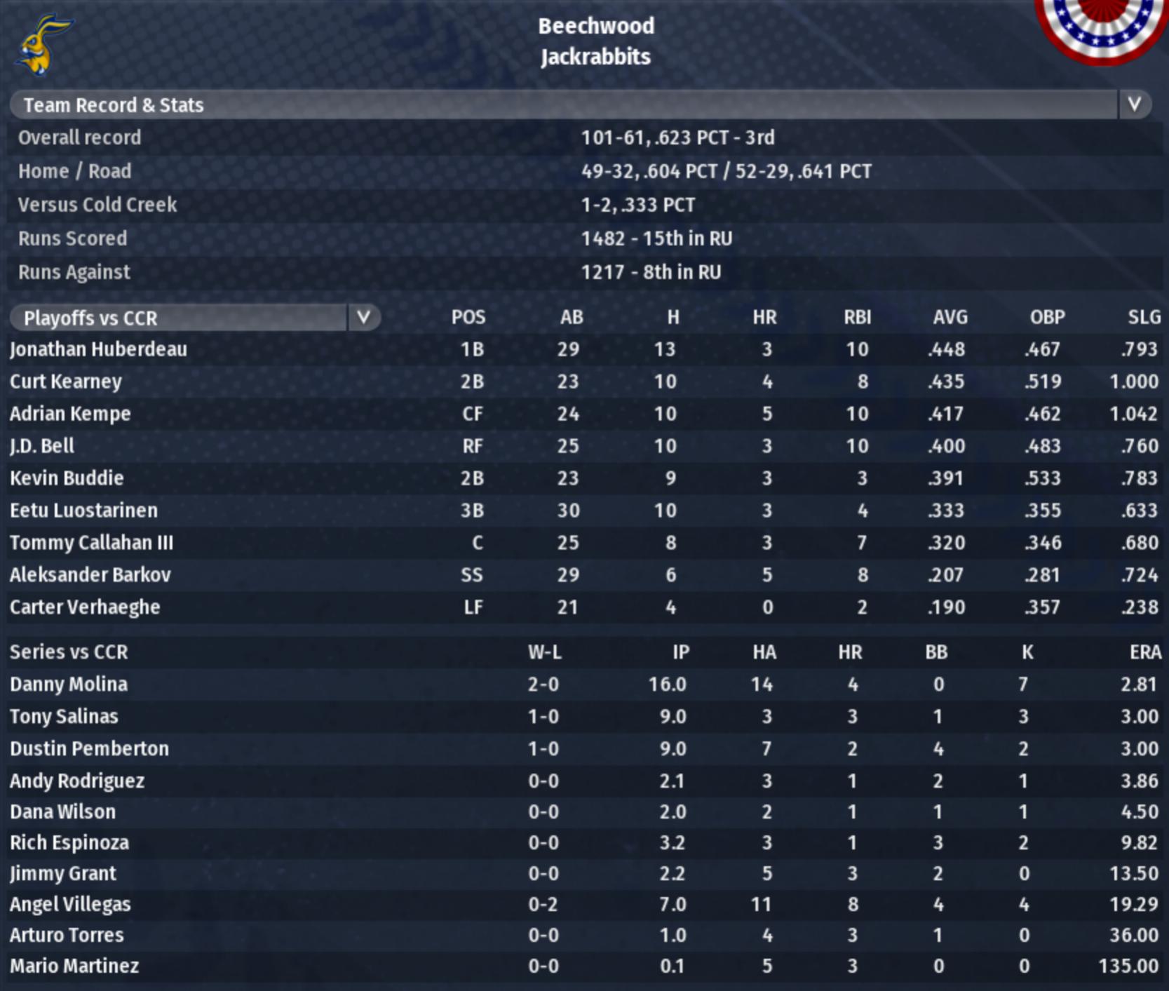 I simulated to the end of the playoffs. The Delacroix Cubs reached their first Pro Cup Final, but the Glasco Celtics beat them in 7 games for their 10th IPA crown.