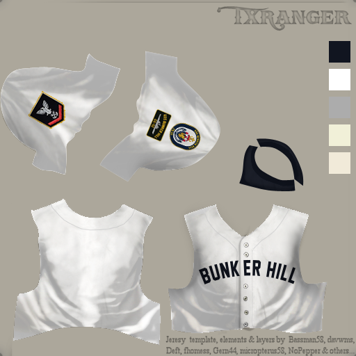 white jersey with the Bunker Hill cap and patch on the sleeve. E-4 chevron on the other sleeve.Bunker Hill in navy blue on the front.