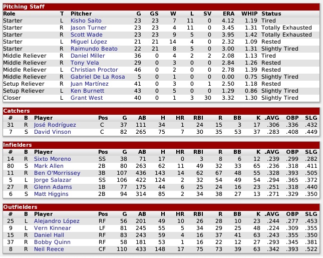 As far as our rotation was concerned, I removed Scott Wade due to his high ERA, although I could have struck Turner just as well. Kisho Saito had had a horrible season, but he still started up front. Don’t ask. He has that sword and will do all possible things with it if he doesn’t start game 1.