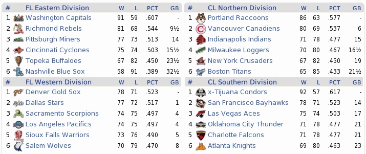 Portland Raccoons (91-71) vs. Tijuana Condors (100-62) The Raccoons play in their fifth postseason, and their third straight, and are the defending World Series champions. The Condors in turn are also in the fifth postseason, but the first since 1990, after losing out to the Bayhawks the last two years. The Condors have never won a championship. The two best defensive teams of the league are going to face up. The Raccoons allowed 596 runs, the Condors only 11 more. But while the Condors also ranked 4th with 753 runs scored, the Raccoons managed only 704 runs, good for merely 8th in the Continental League. While the Raccoons used to draw on their murder pitching for years, there are spots on their staff this year. Closer Grant West is not aging gracefully, despite logging his 500th save this year, and ace Kisho Saito had his worst season in memory and lost 15 games. The bullpen as a whole is still about the best in the league. The Condors will field an 18-, a 17-, and a 16-game winner for this postseason, and a rotation with four guys safely below 4 in terms of ERA. The main weakness is their lack of effective left-handed arms, with only two southpaws on the entire staff. Closer Jose Lopez lost 11 games this season, even trumping 1-6 Grant West. Offensively, the loss of C Andres Manuel will hurt the Condors, but they can draw on other sources for runs, like outfielders Preston O’Day (.314, 19 HR, 89 RBI) and Paul Theobald (.355, 2 HR, 73 RBI). Their infield is especially dense, with five players having logged 130 hits or more. The Raccoons’ offense has revolved around Ben O’Morrissey (.308, 20 HR, 85 RBI) and Neil Reece (.323, 18 HR, 94 RBI) all season, with surprise walk-on Alejandro Lopez (.272, 18 HR, 56 RBI) doing a lot of damage in just four months on the team. However, O’Morrissey has been slumping all of September, and Neil Reece strained his hamstring in the penultimate week and will not be available for at least the first couple of games, and maybe only for potential games 6 and 7. Whether the Raccoons will survive for that long? Condors have the upper hand here, and should win in five games. --- Yeah, those guys at BNN are not kind to us for sure. But they are right. The offense was bad all year. O-Mo is in a valley, and Reece is hurt until at least game 4 or so. The rest of the team hasn’t done many uplifting things in the meantime. We had 26 playoff roster eligible players, with INF Marvin Ingall the odd man out. Had Glenn Johnston been eligible, I would have taken him over 1B Glenn Adams, but he wasn’t. It would have merely been for defense, starting in center as long as Reece was knocked out. Reece *is* on the roster (and there are no issues this time with roster befuddlements), but will have to wait for that leg to heal up. Heal up faster!!
