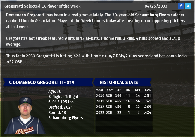 Metropolis RF Winston Churchill is named NL POTW. Flyers C Dom Gregoretti is named IBL LA POTW. Boomers 3b Charles Tinter is named DA POTW. Madison loses SP Franklin Adams for the season.